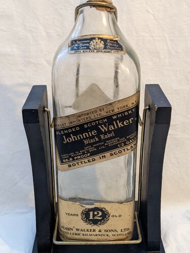 Up for sale is a 16 inch tall Johnnie Walker 1 liter 12 Year Old Bottle Wood Swing Cradle Stand Scotch Whiskey