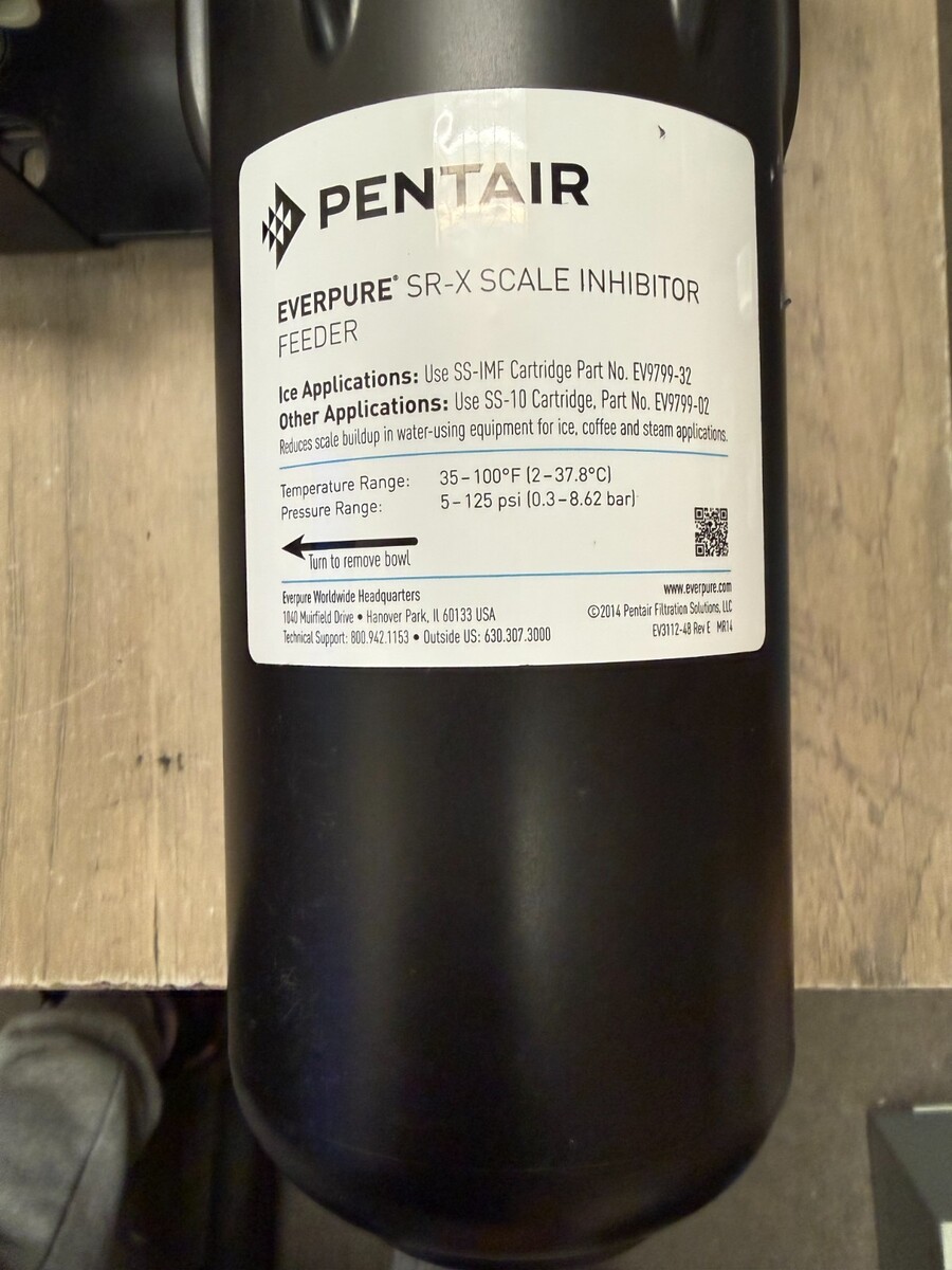 The Pentair Everpure SR-X is a scale inhibitor feeder + deliming system used in commercial water applications. Instead of filtering particles, it injects a controlled dose of scale-inhibiting chemistry into the water stream to prevent mineral buildup.