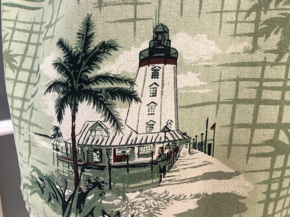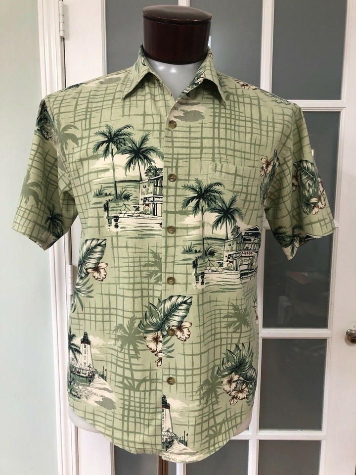 Summa Men's Large Green Retro Hawaiian Shirt Silk Palm Tree Lighthouse Floral
