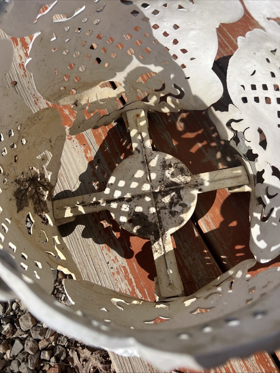 Note these are used and have been outside. They have discoloration and chipping of paint mostly at the bottom, it could be cleaned up and repainted if you wanted or leave for the shabby rusty metal look approximately 12 inches tall 12 inches wide and about 11 inches from bottom to top. shipping to Alaska or Hawaii will require additional shipping fee. I have two of these for sale, sold separately, but they do both have the same condition issues so you will get one or the other if you only order one.