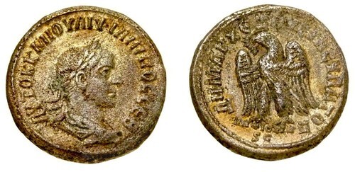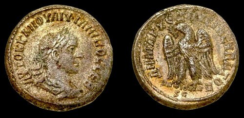 Reverse: ?HMAPX ?? OVCIAC Y?ATO?, eagle standing left, wings open, with wreath in beak; ANTIOXIA / SC in exergue.
