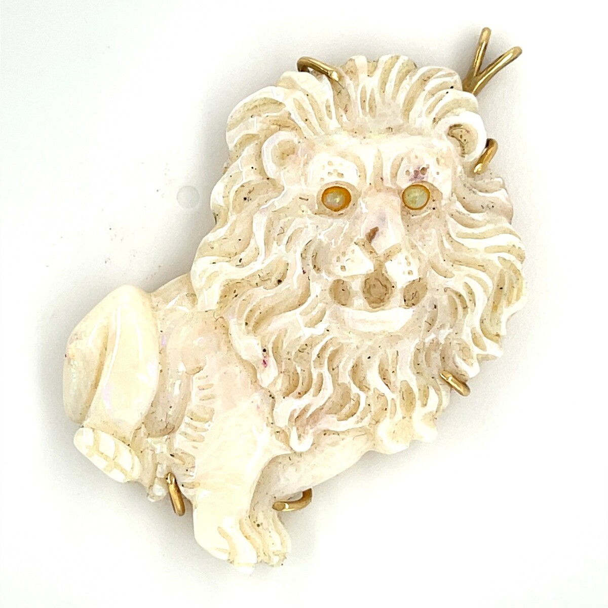 Ciondolo a forma di leone opale intagliato con montatura in filo di oro giallo 14k