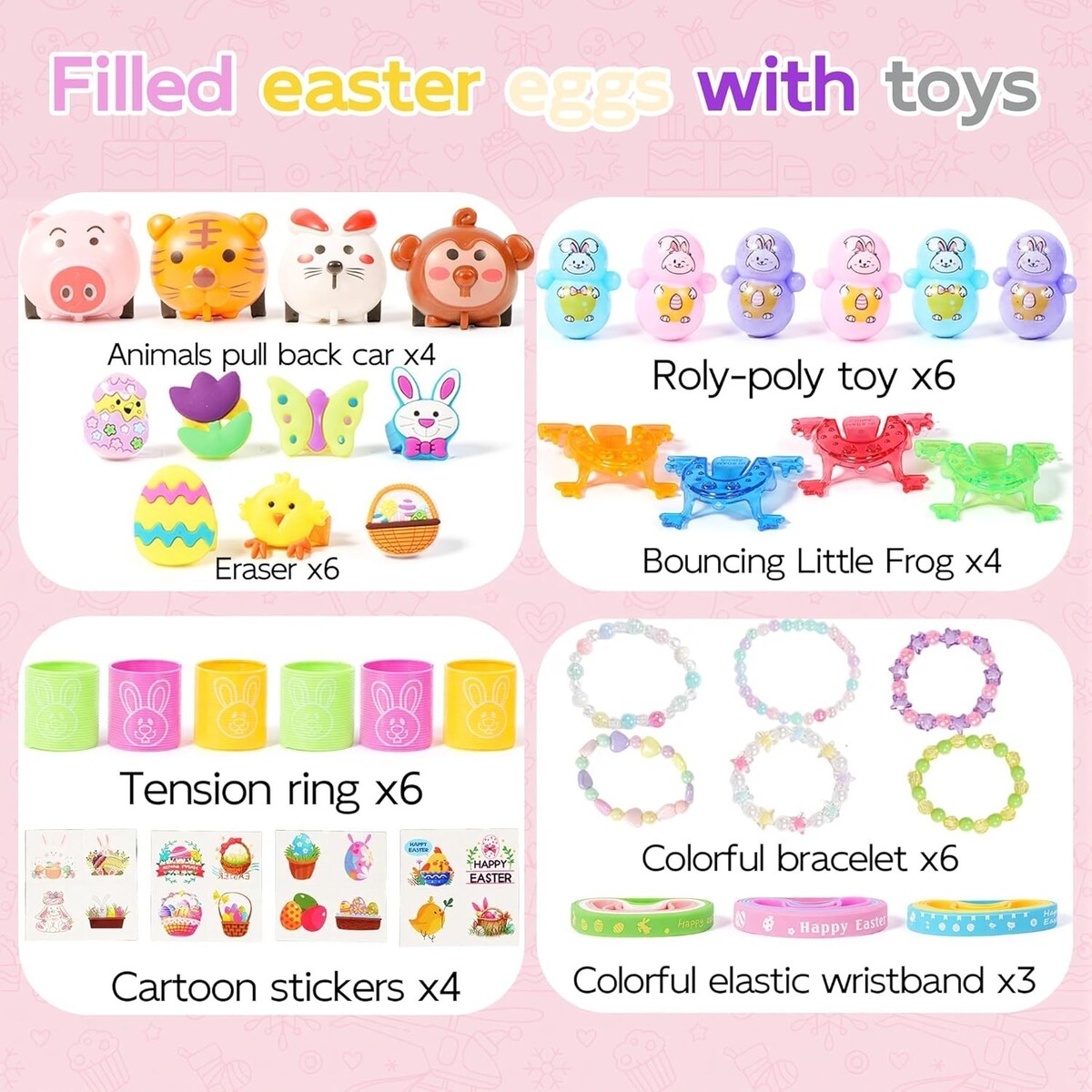 Engaging party favors: Our Easter egg stuffers set is not only perfect for Easter egg hunts but also serves as engaging party favors for themed Easter parties. Children will love playing with these toys, enhancing the enjoyment of the celebration.