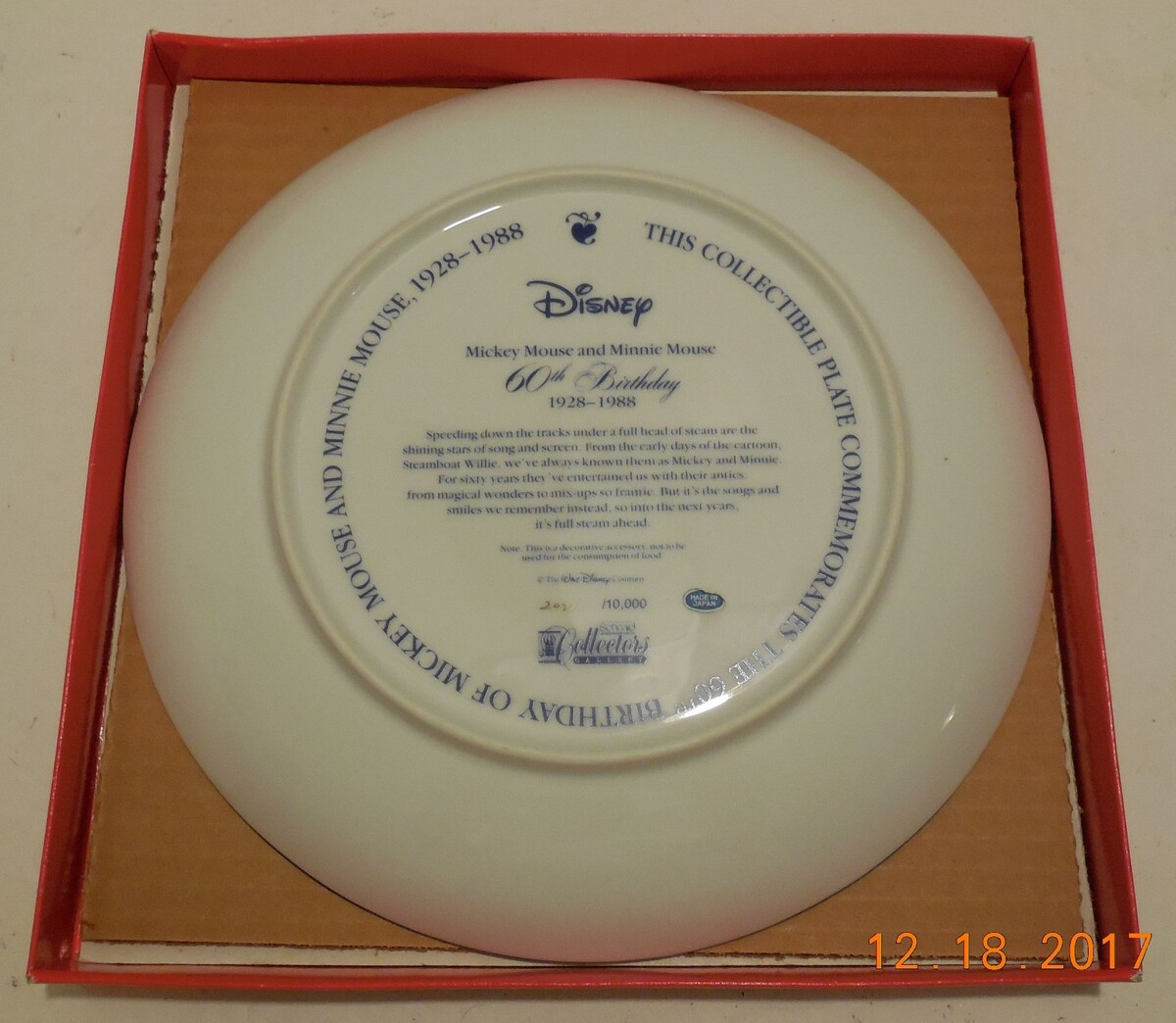 Mickey Mouse and Minnie Mouse 60th Birthday 1928-1988 Collector Plate Limited Ed