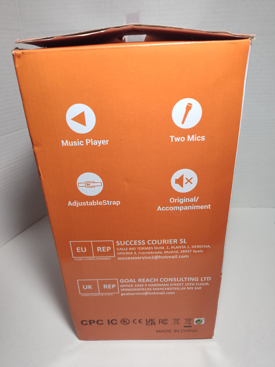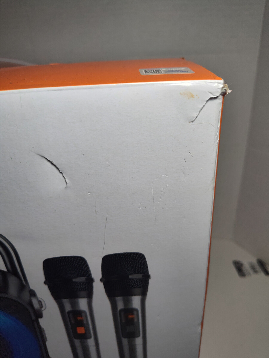 This unit is NEW OPEN BOX ? the karaoke machine and microphones are unused and in excellent condition. The outer box has dents from storage/shipping, but the contents inside are fully intact and undamaged.