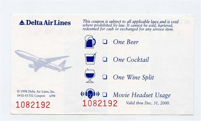 EXPIRED AND Unusable. For collecting only.An unused Delta Airlines Movie Headset Wine Split Cocktail Inflight Coupon Expired Unusable. Numbered and dated 2000