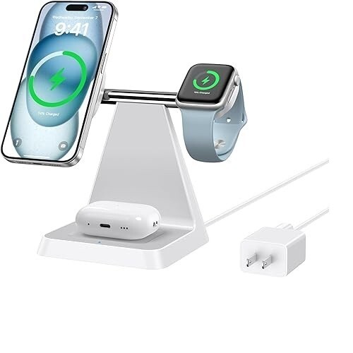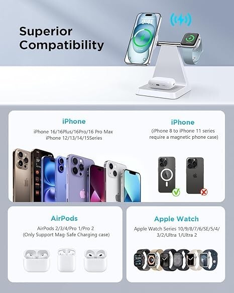 Magnetic 3-in-1 Wireless Charger for Multi Device: Just one cable to charge iPhone, AirPods, and Apple Watch simultaneously; Compatible with magsafe Charger iPhone16/15/14/13/12 series (iPhone 8 to iPhone 11 series require a magnetic phone case); Also charger stand compatible with Apple Watch Series 10/9/8/7/6/5/4/3/2/1/SE/Ultra 1/2 and AirPods. (Note: only support AirPods 2/3/4 with magnetic devices)
