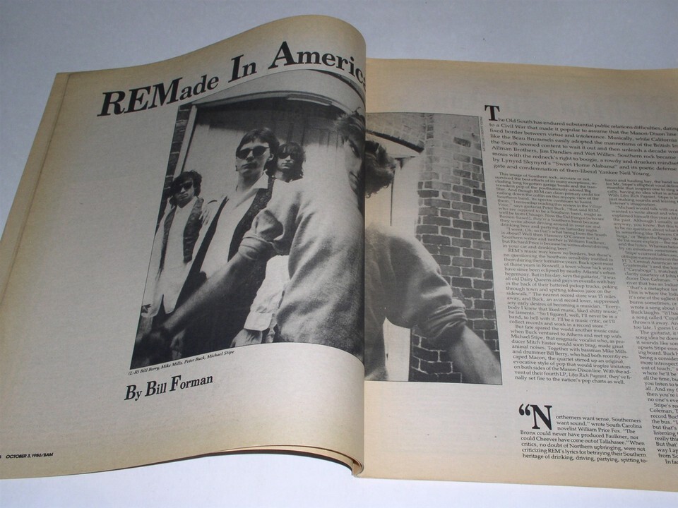 This is the October 3, 1986 issue of "BAM" magazine. Cover story on R.E.M. Inside: Screaming Blue Messiahs, T. Rex, Great White, The Ramones. A terrific item for the fan or collector.