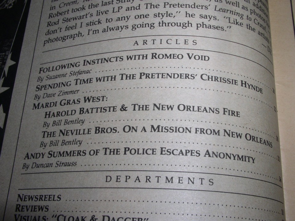 This is the August 24, 1984 issue of "BAM" magazine. Cover story on Chrissie Hynde of The Pretenders. Inside: Romeo Void, Mardi Gras West with Harold Battiste The New Orleans Fire and The Neville Brothers, Andy Summers of The Police. A terrific item for the fan or collector.