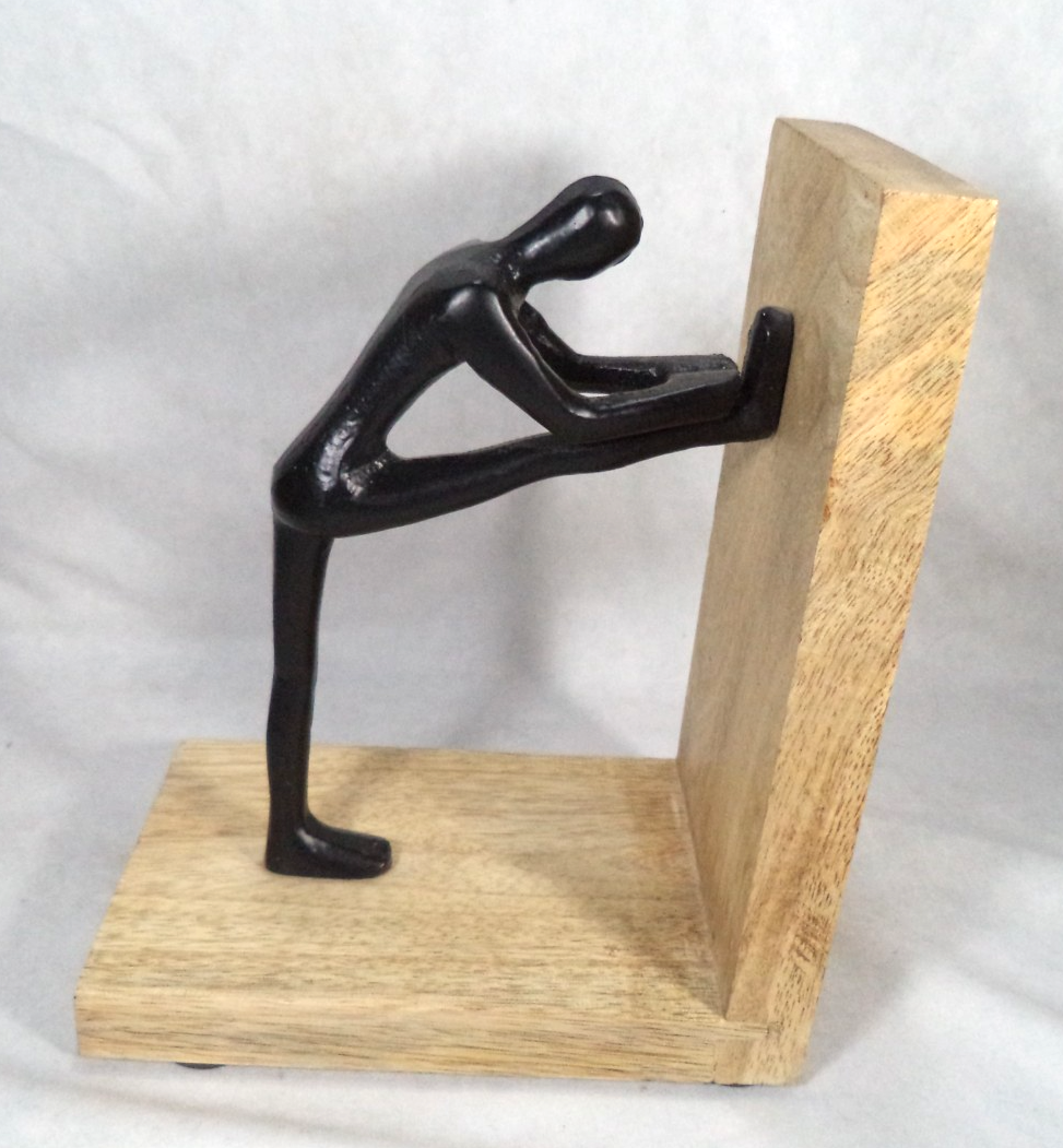 Brutalist Black Wrought Iron Metal Man Stretch Push Pose Bookend Rustic Wood Art