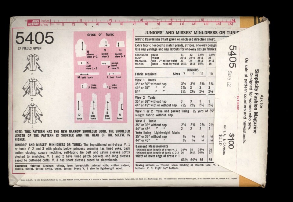 SIMPLICITY 5405- Misses' Mini Dress or Tunic - Size 12 Bust 34 * 1972 uncut