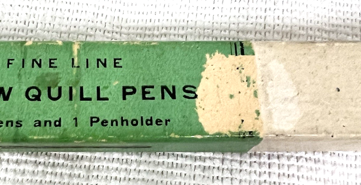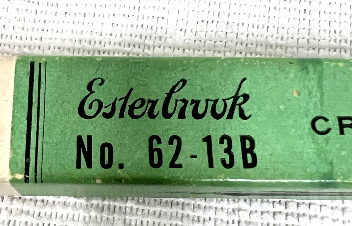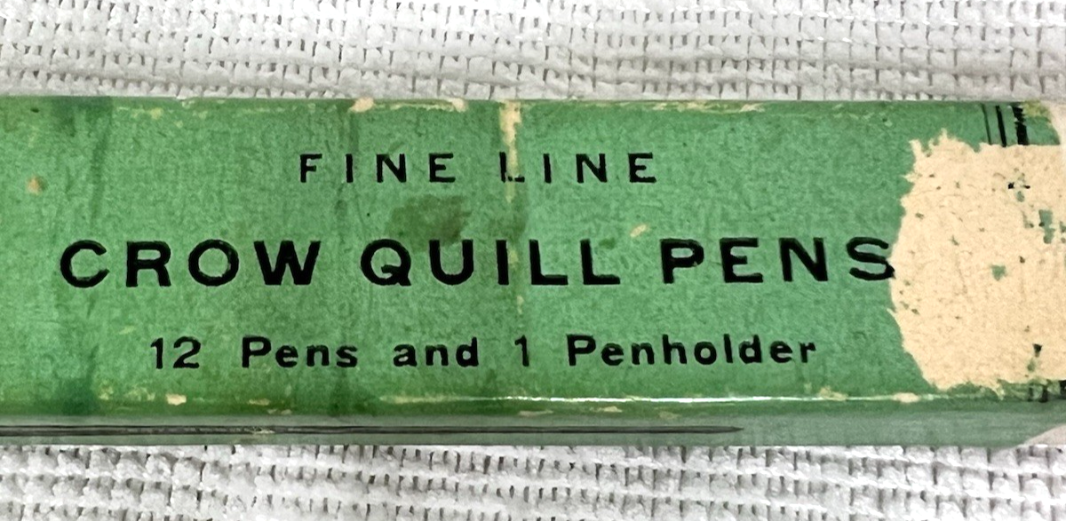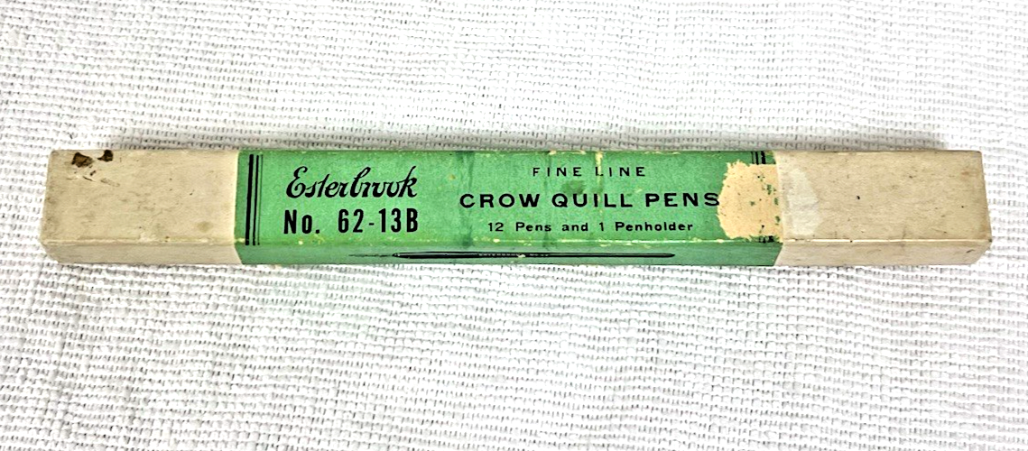 Vintage Esterbrook Crow Quill Fountain Dip Wood Penholder 12 Nibs Plus 1 Box. Esterbrook No. 62-13B Crow Quill Pens marked box, inside wood penholder unmarked 12 small Esterbrook nibs plus one oval point Esterbrook nib, box in fair to better condition, some marring to paper label, dirtiness, box measures approx. 7 1/8" long, 3/4" wide, and 5/8" tall. See pictures.