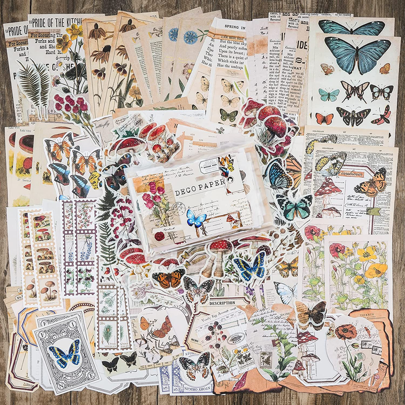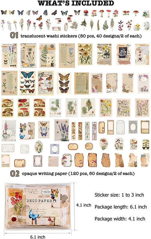 VALUE SET - Each package comes with approximately 200 pieces of assorted paper sticker ephemera kit, including 120 pieces of matte writing paper (opaque) and 80 pieces of translucent washi stickers. A large collection of all kinds of vintage style junk journal goodies!