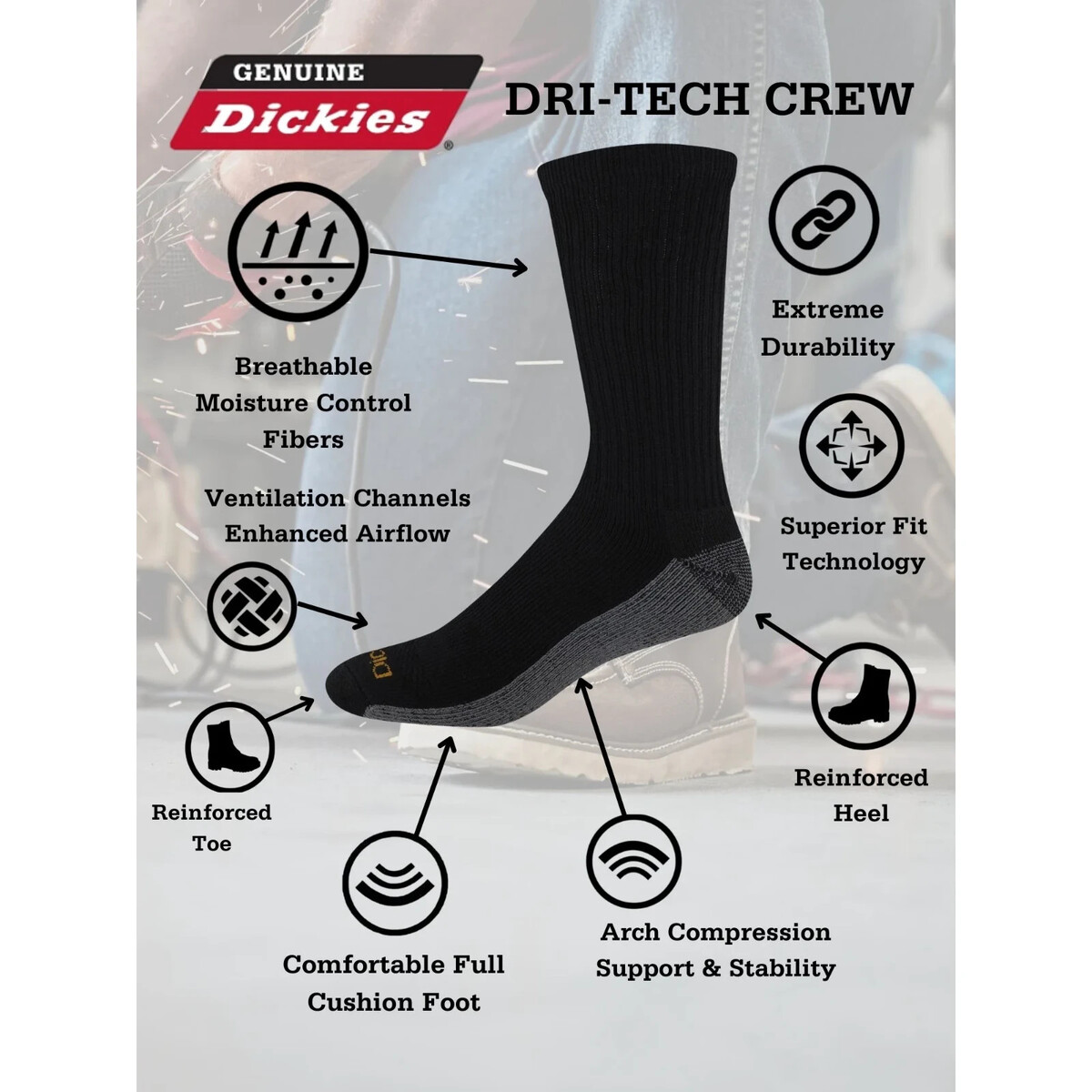 Dickies Men?s Dri-Tech Crew Socks are the #1 Selling Work Sock in America, chosen by the most workers each day, for superior performance, comfort and durability. Dickies Men?s Dri-Tech Crew Socks are designed with advanced sweat-fighting moisture control features to keep your feet cooler, drier and comfortable, all day. Mesh ventilation channels in the foot enhance airflow for added breathability and cooling, to keep feet feeling refreshed. The fully cushioned footbed delivers added comfort, to keep your feet feeling great, whether you?re working, standing all day, or on the move. With best-fit arch compression, Dickies Dri-Tech Crew socks provide added support and stability, ensuring a comfortable fit that stays in place throughout your day. Dickies Dri-Tech Crew socks are also engineered with reinforced and reciprocated heel and toe construction, that provides added durability and ensures a superior fit. Whether you?re on the job site or out in the great outdoors, these Dickies socks will keep your feet dry and comfortable all day long.