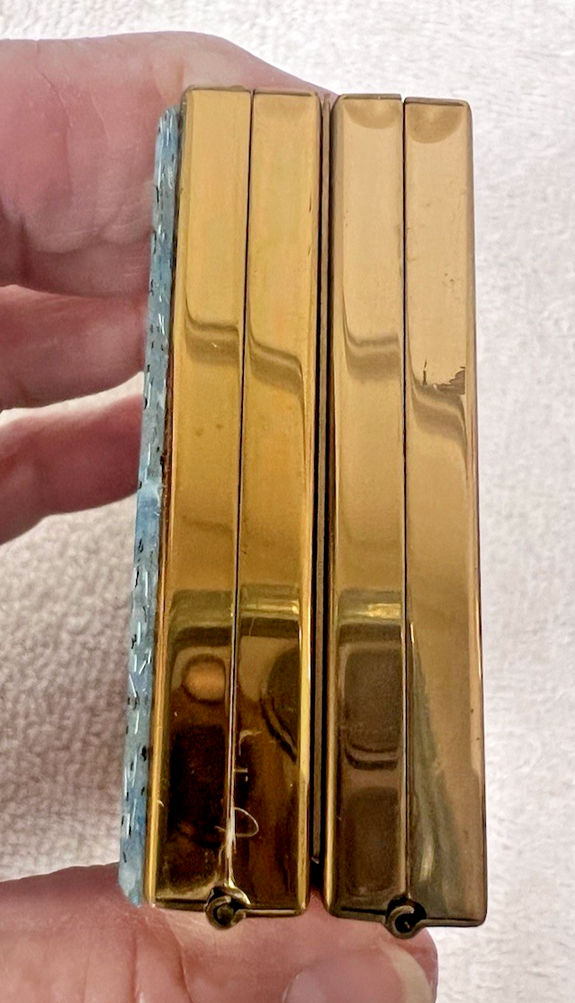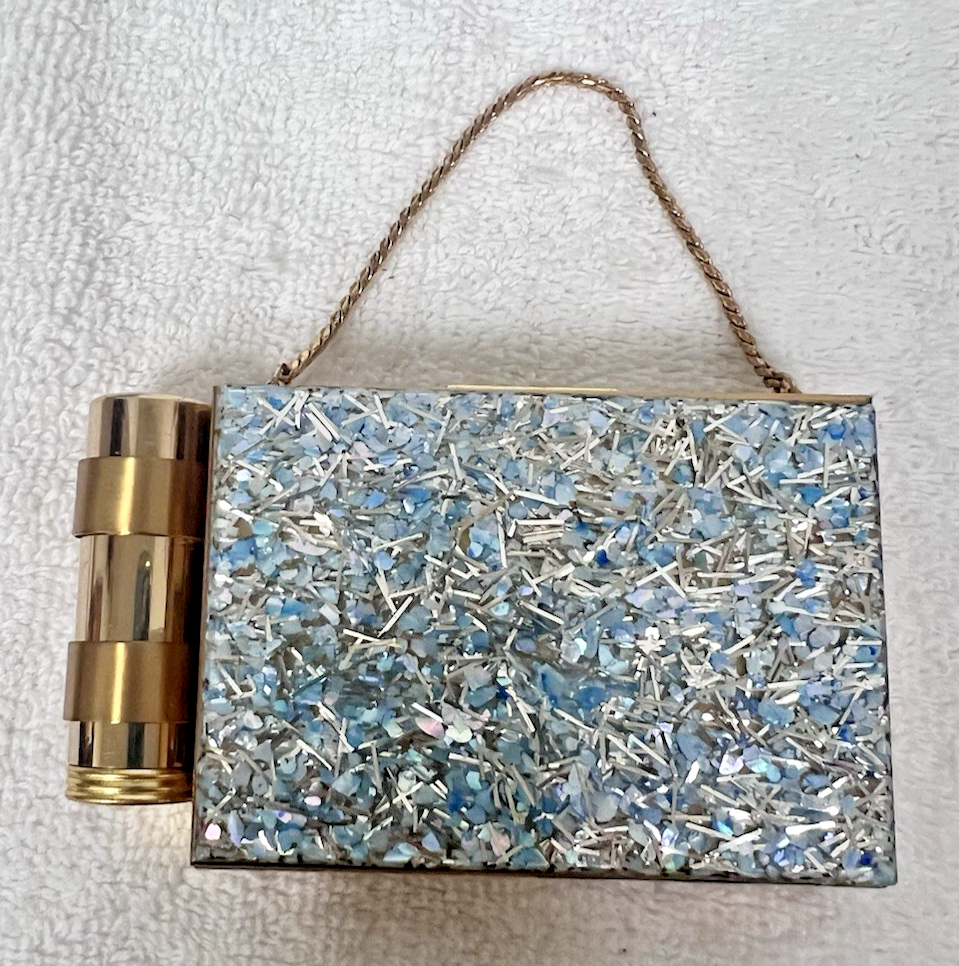 Zell NOS Vintage Compact Purse w Lipstick Blue Silver Purple Glittery Top 2 Sided Box