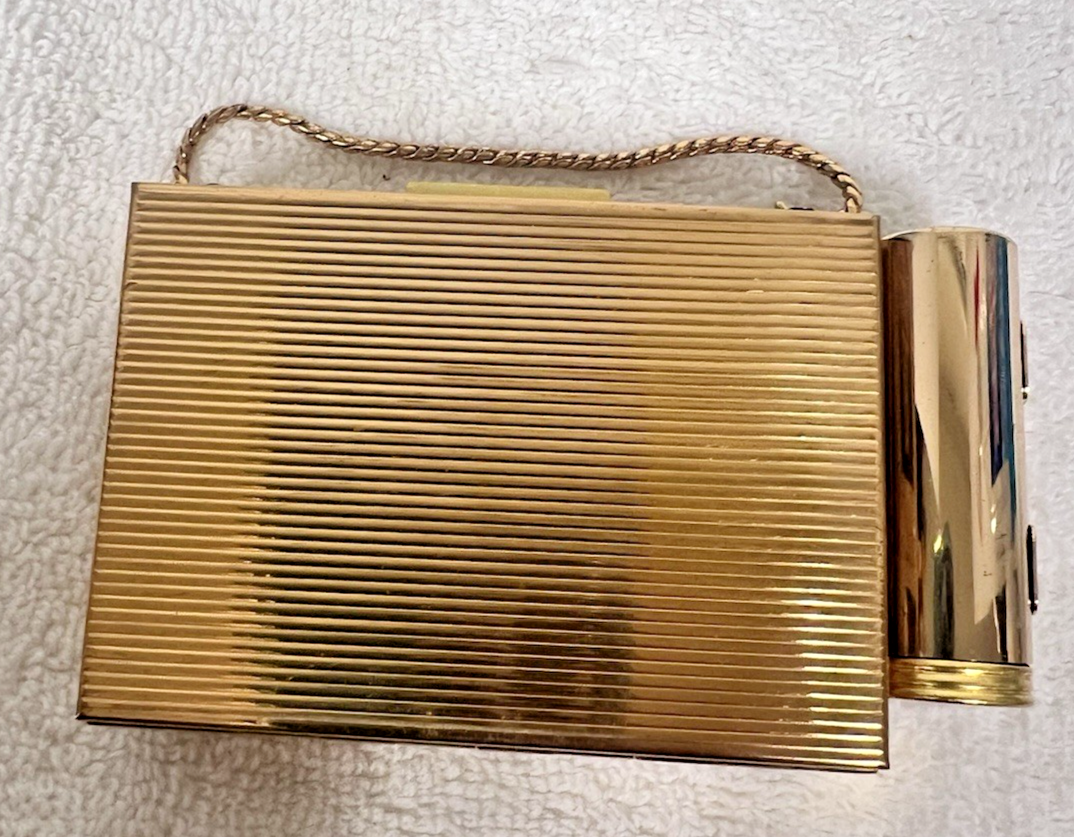 The case wo the lipstick measures 3 1/8 x 2 1/4 x 7/8. The lipstick was never used the powder side also never used with a screen and puff and the other side for possibly money? The little chain to hold it by is about a 2-inch drop Zell is the maker (on the puff and box)