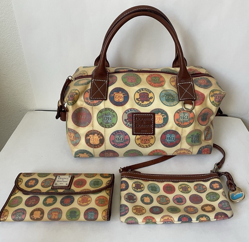 Vtg Dooney & Bourke medallion travel handbag purse w/wallet & wristlet Flaws