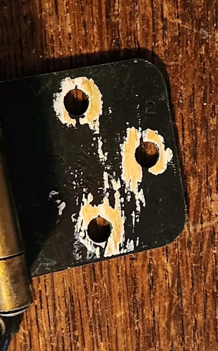 Good used condition hinge. Brass look. Not real brass. 2.75 inches long. 1.5 inch wide at the 3 hole door mount.