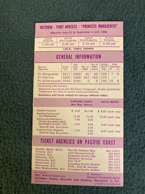 Vtg 1968 Canadian Pacific Ferry Princess Marguerite Seattle Canada Schedule Excellent crisp condition.