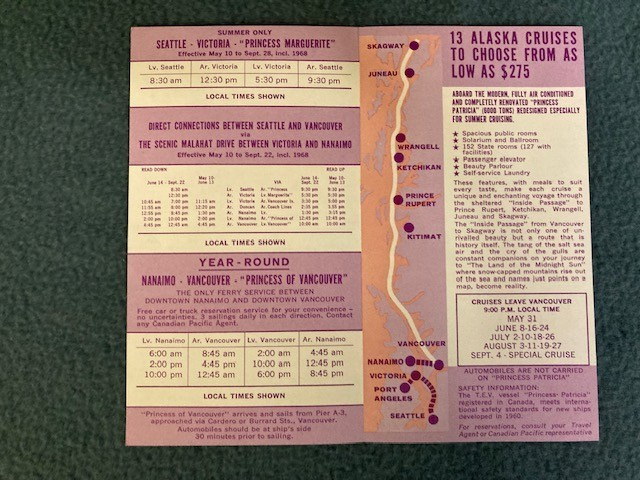 Vtg 1968 Canadian Pacific Ferry Princess Marguerite Seattle Canada Schedule