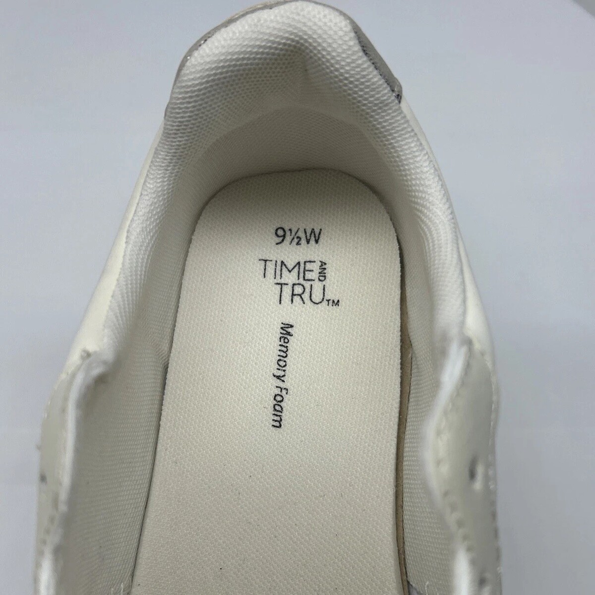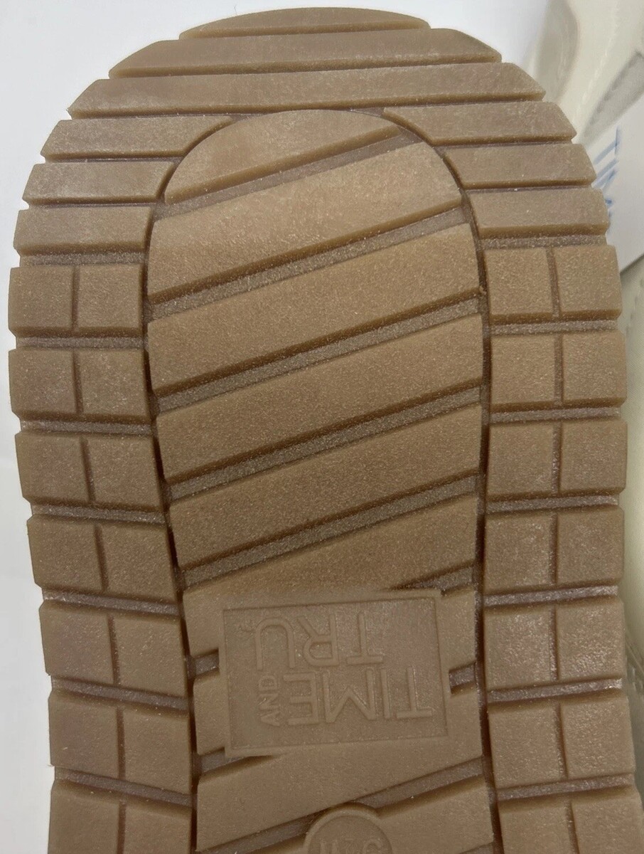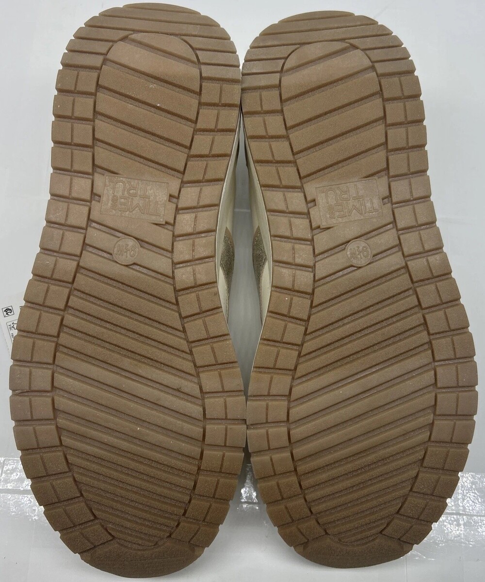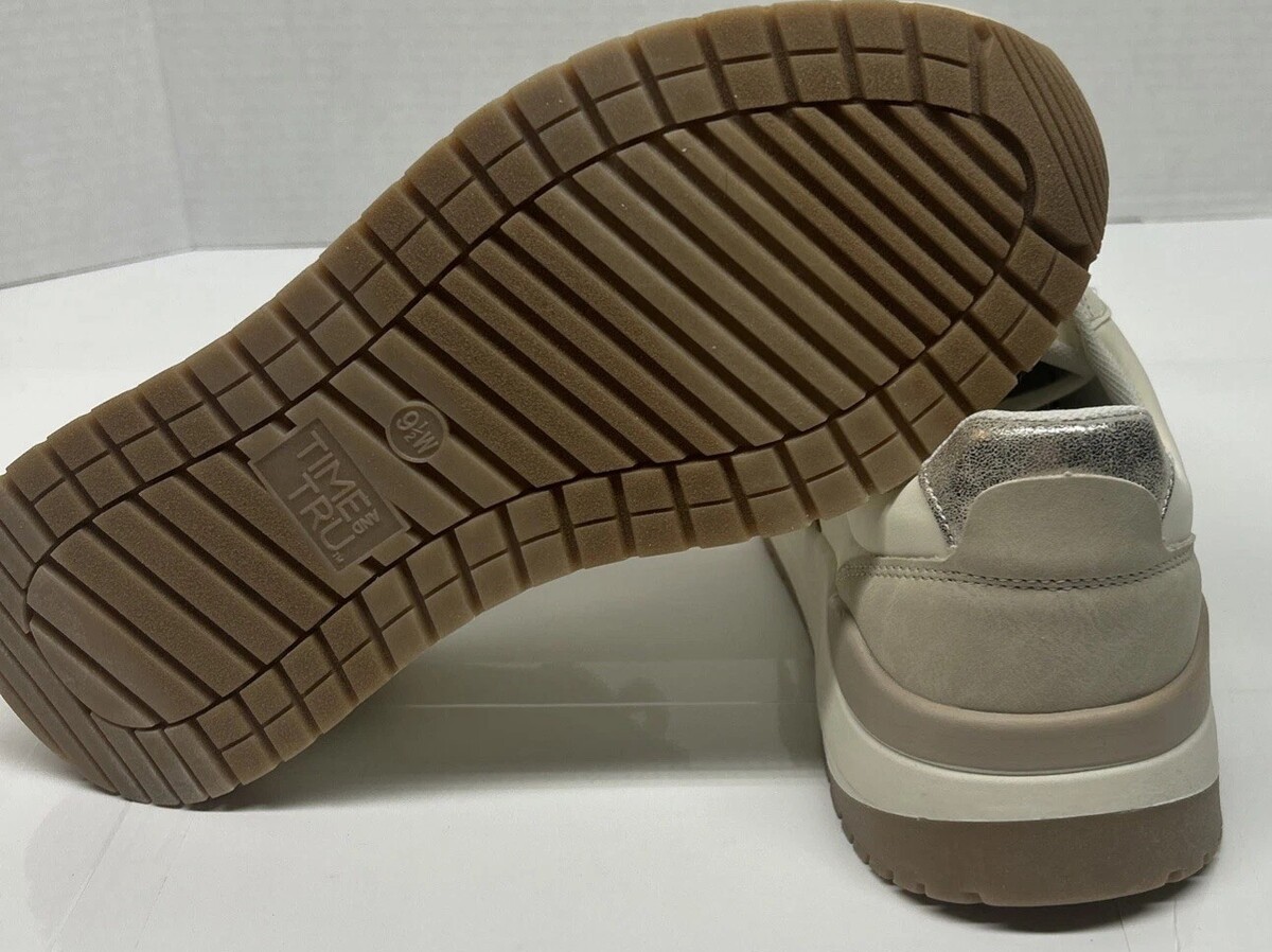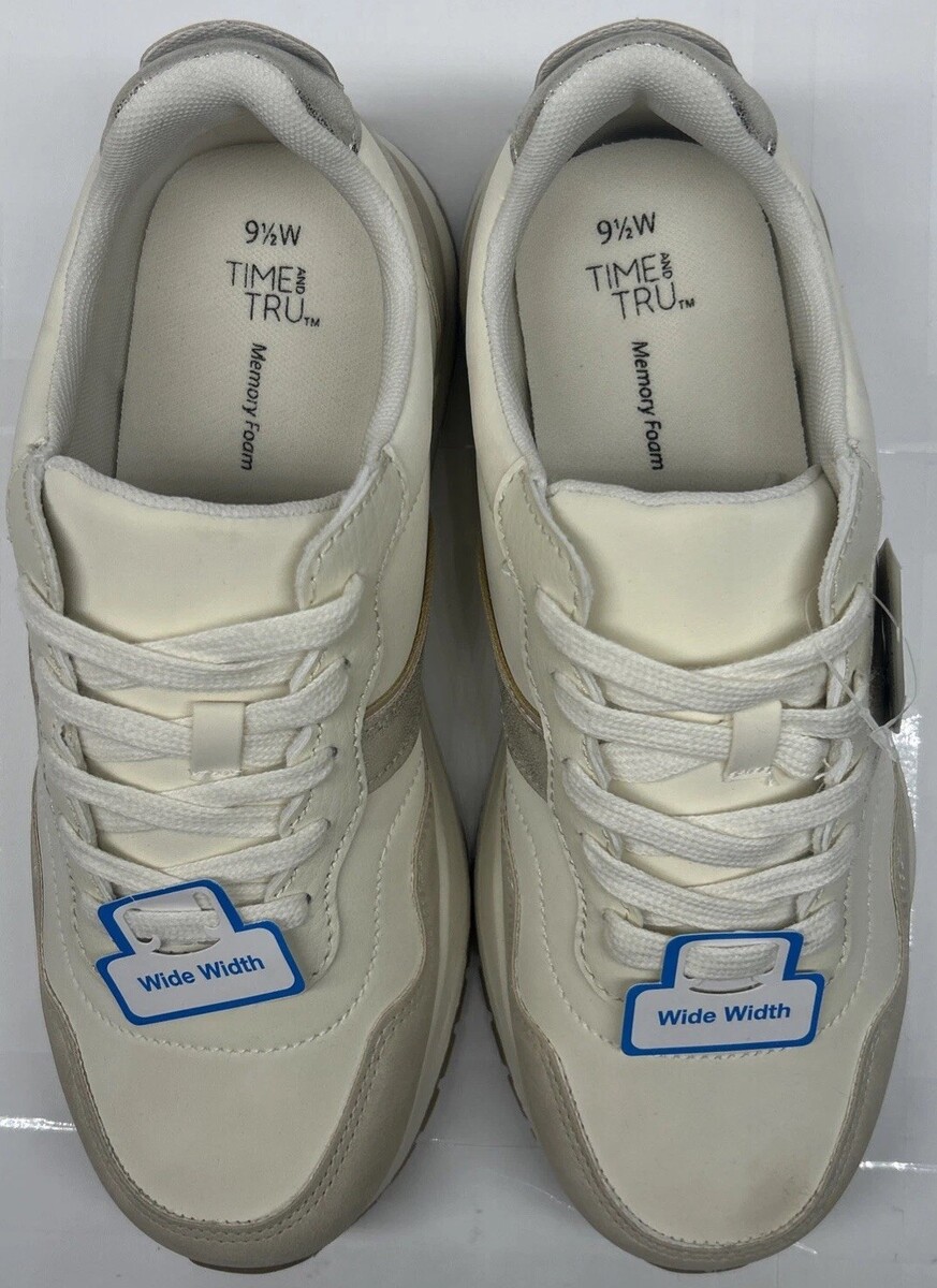 These are new tan and gold jogger sneakers for women in size 11.5 Wide. They feature a lace-up closure, chunky heel, lightweight design, and durable outsole. The sneakers are designed for activewear, casual, or workwear occasions, with a cushioned insole for comfort. Made of Polyester inner fabric. The outer material is Faux leather with gold accents. They have a low-top shaft style and a rubber cleat type sole. The shoes are part of the Time and Tru product line, offering a modern and stylish option for walking or running activities.