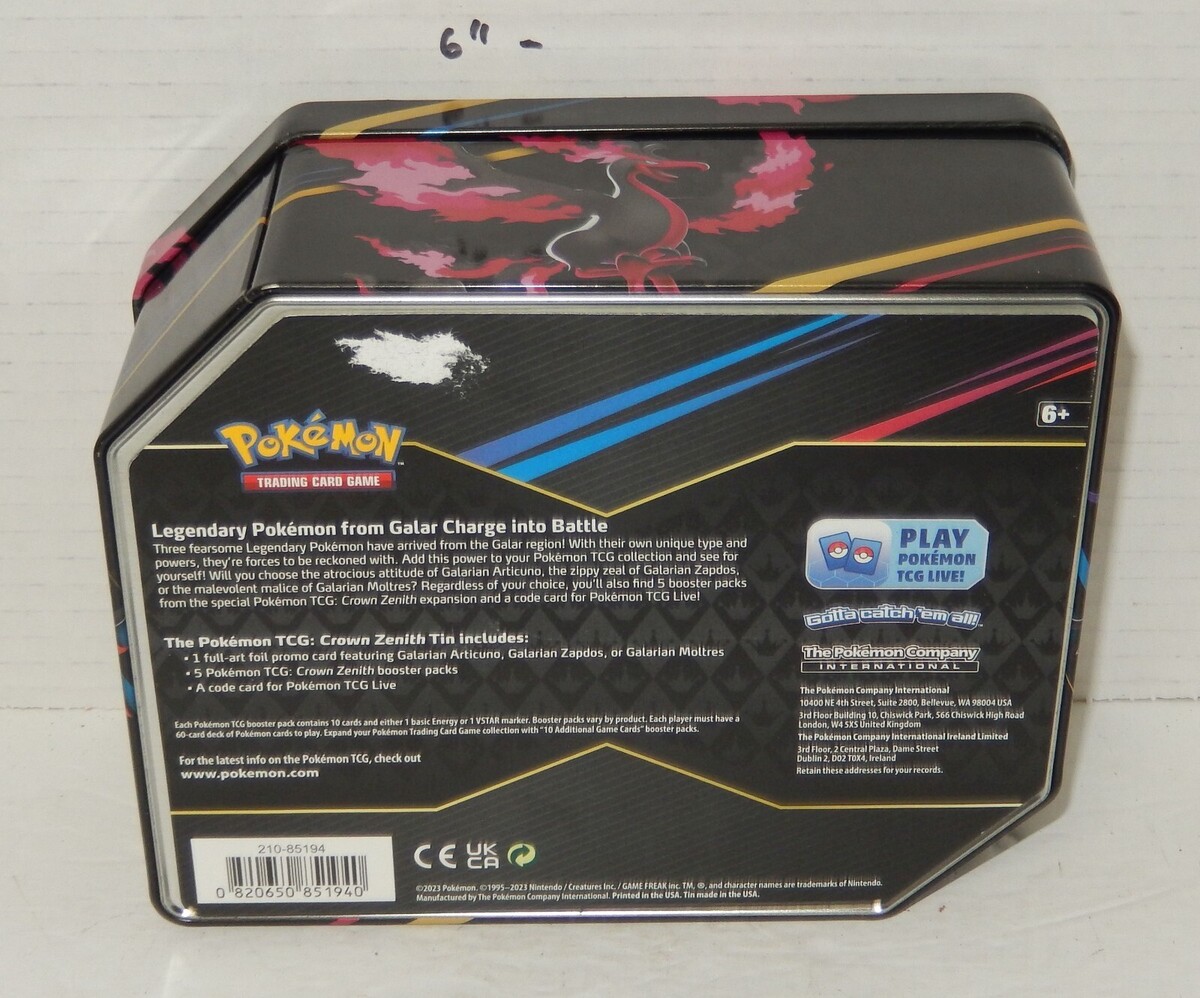 For Sale is a Pokemon TCG 2023 Crown Zenith Galarian Moltres Tin EMPTY! Its In good USED condition. It includes whatever is in the pictures provided. Please ask Any and All Questions prior to purchasing. Great For Carrying Your Pokemon Cards around in. Fast Same or Next day shipping with Free Delivery Confirmation within the U.S. Payment Due within 7 days of purchase (if you need more time please let us know In advance) we love to combine shipping is always a Yes and Most of the time Additional Items Ship for free. SKU4MS