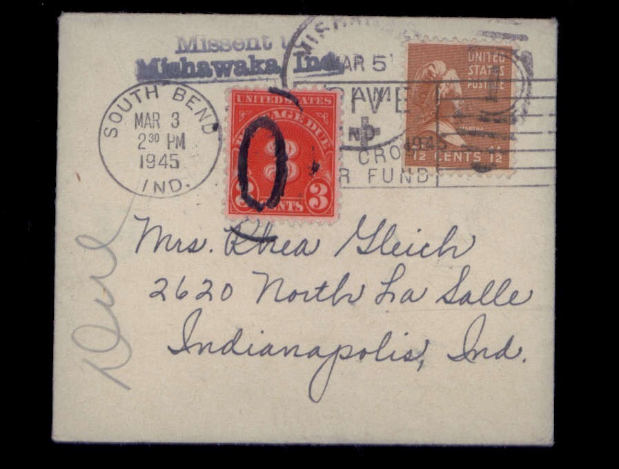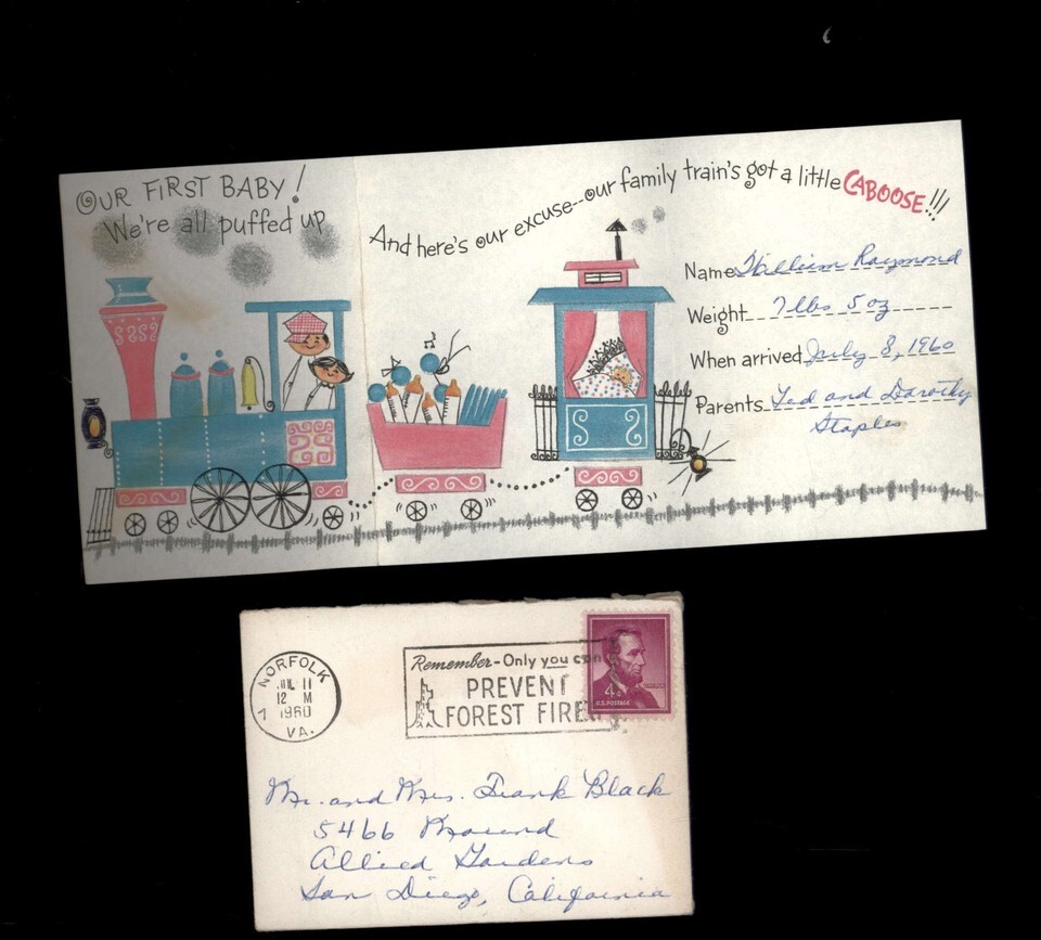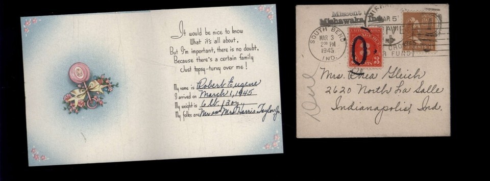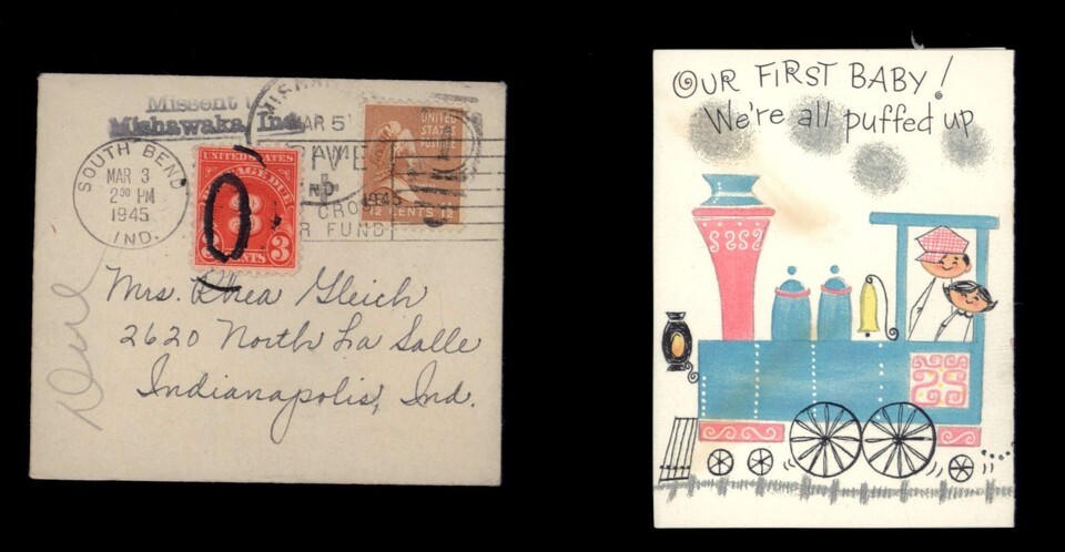 1945 & 1960 BIRTH ANNOUNCEMENT with Envelope Stamps 1-1/2c - 3c Postage Due 4c