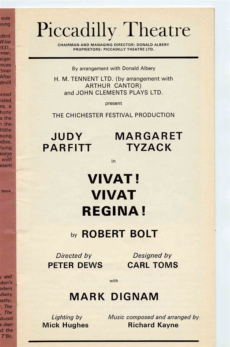 From the Piccadilly Theatre in London in the 1970's. A Program from Vivat! Vivat Regina! , starring Judy Parfitt and Margaret Tyzack .