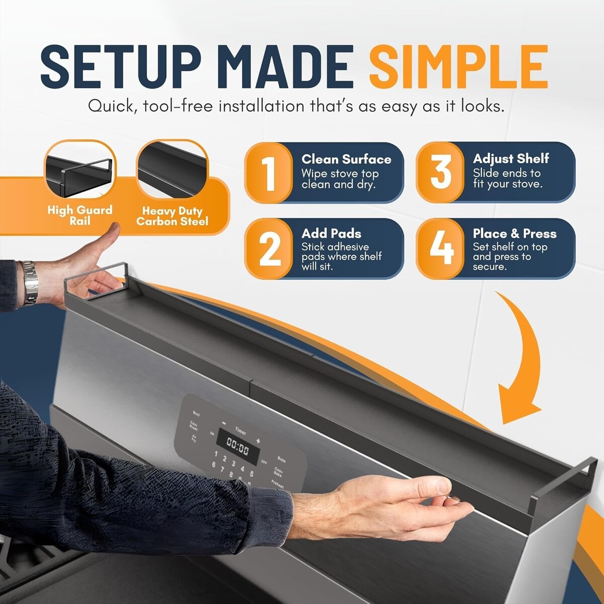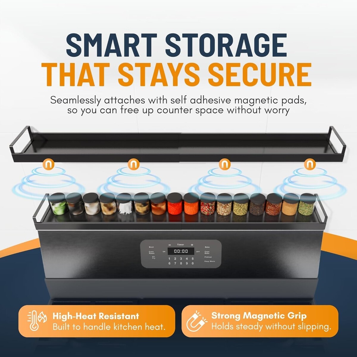 Quick Easy Installation: No tools required! Our shelf easily attaches with four heavy-duty adhesive magnets, or for non-magnetic stoves, use the provided adhesive stickers for a damage-free setup.