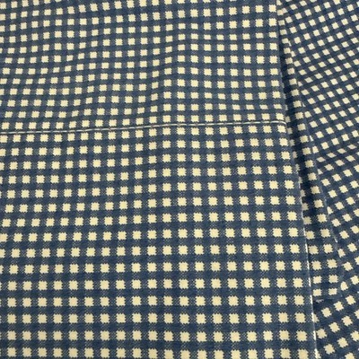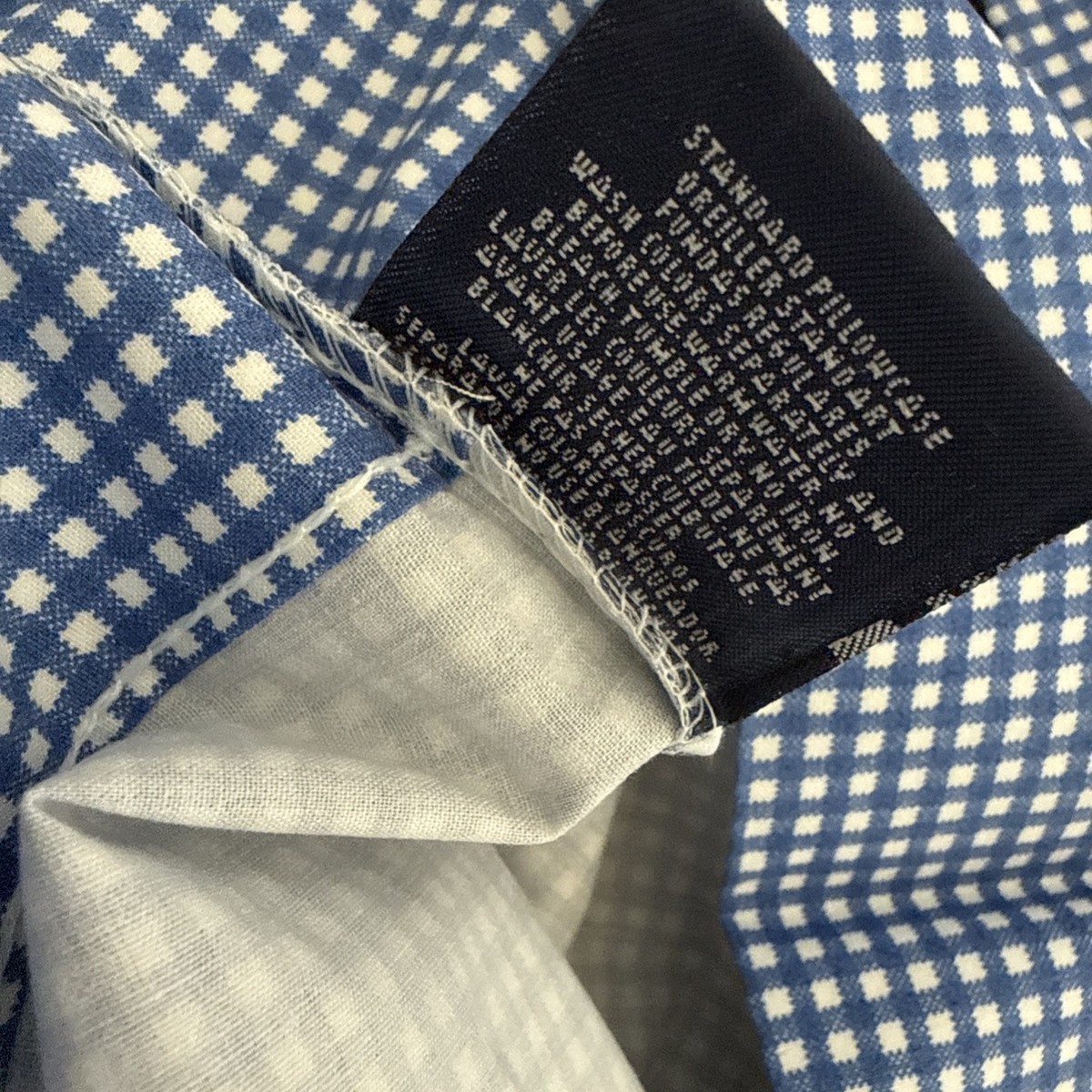 The product is a set of two standard pillowcases by Ralph Lauren, featuring a vintage small gingham pattern in blue and white. Made from 100% combed cotton, these pillowcases are 20 x 30 inches in size and have a ruffled design. Suitable for Queen, Full, and Twin beds, they are perfect for adding a touch of classic style to any bedroom decor.