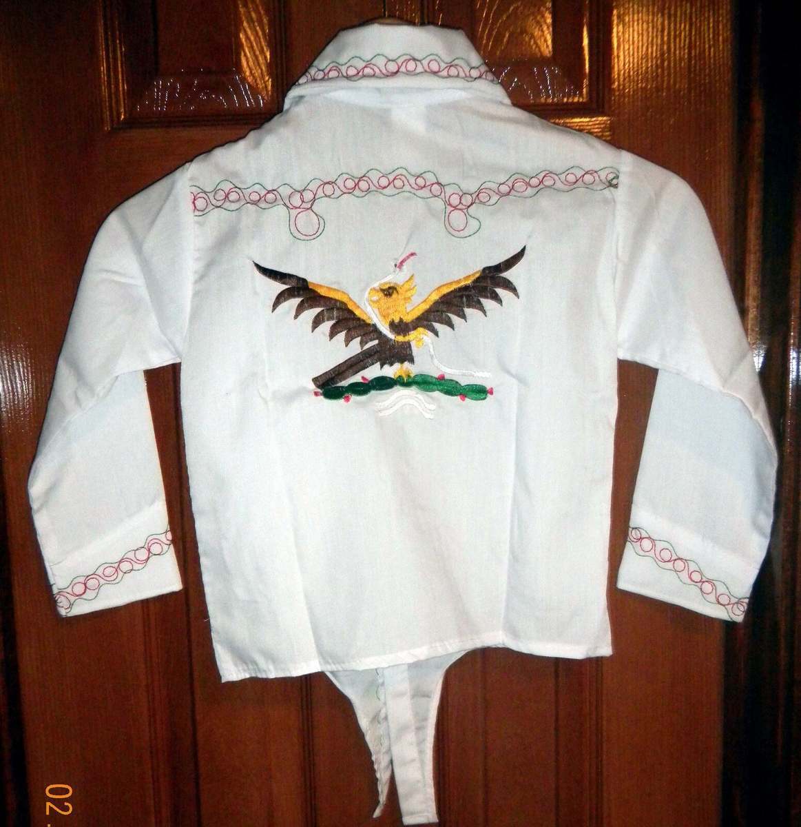 These have designs all over the shirts, for example on the collar, cuffs, chest, next to the button down, also they have front pockets with a catus embroidery on each pocket, the front has a double strap to tie down on a knot, and the back has a beautiful eagle embroidery design.