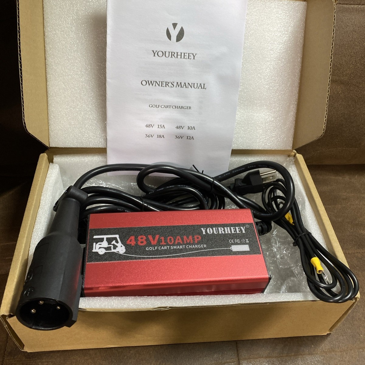 The 48V/10A Golf Cart Smart Battery Charger by Yourheey is designed for Club Car with a 3 pin plug. It is compatible with E-Z-GO vehicles and has a 1 year warranty. This unit is designed for various golf cart models ranging from 1996 to 2023. Made in China, this charger is ideal for maintaining and charging your golf cart battery efficiently and effectively.