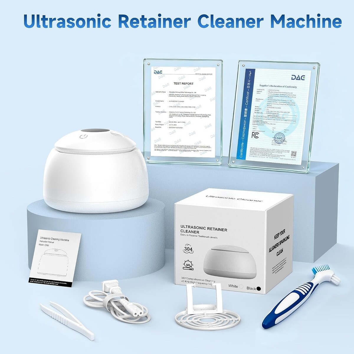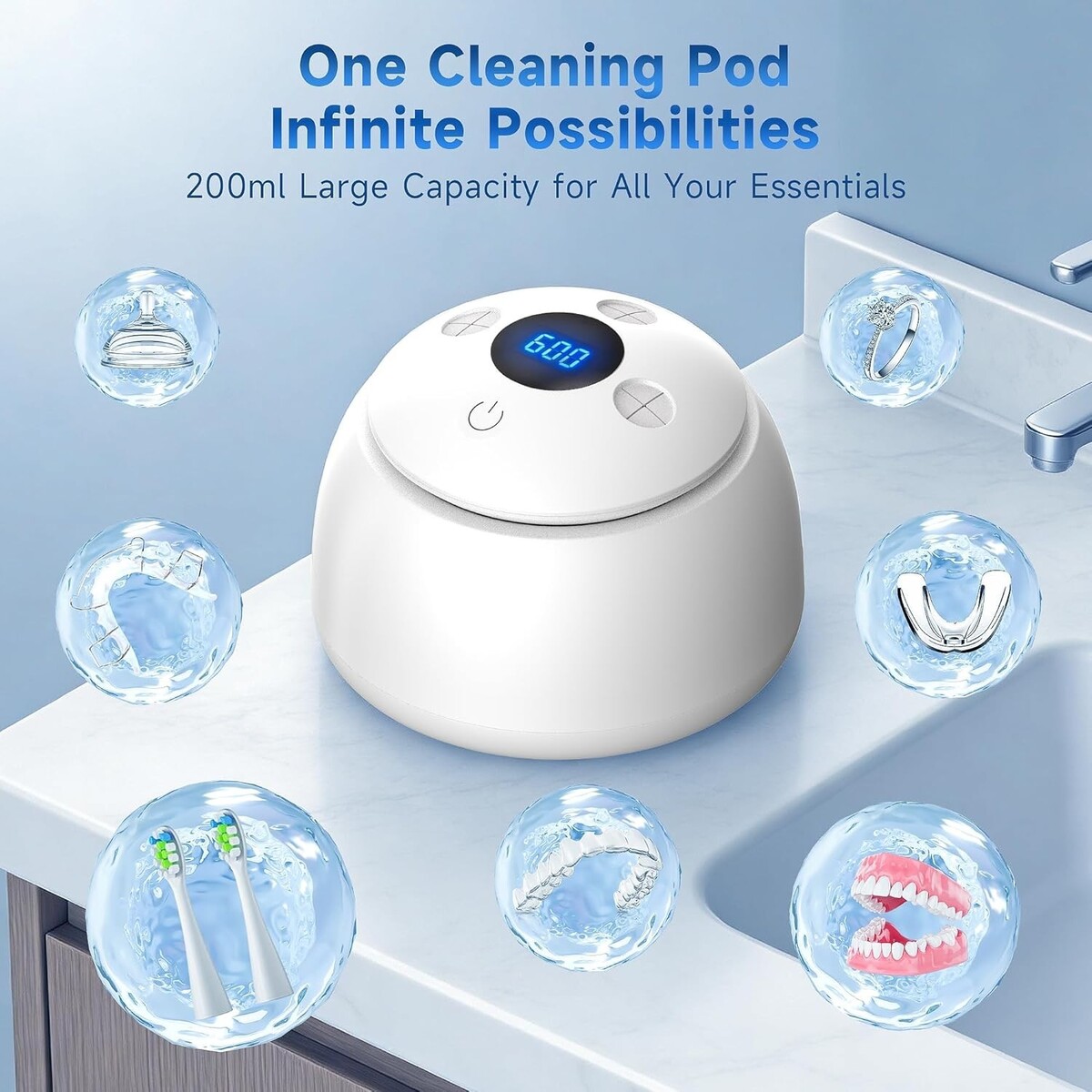 ?200ml Capacity Smart Design?Crafted with 304 stainless steel liner, the dental cleaning pod fits upper and lower dentures simultaneously. It features a detachable drain bracket that allows your appliances to air-dry hygienically after cleaning. This smart design, along with included tweezers, ensures a mess-free experience without wetting your hands.