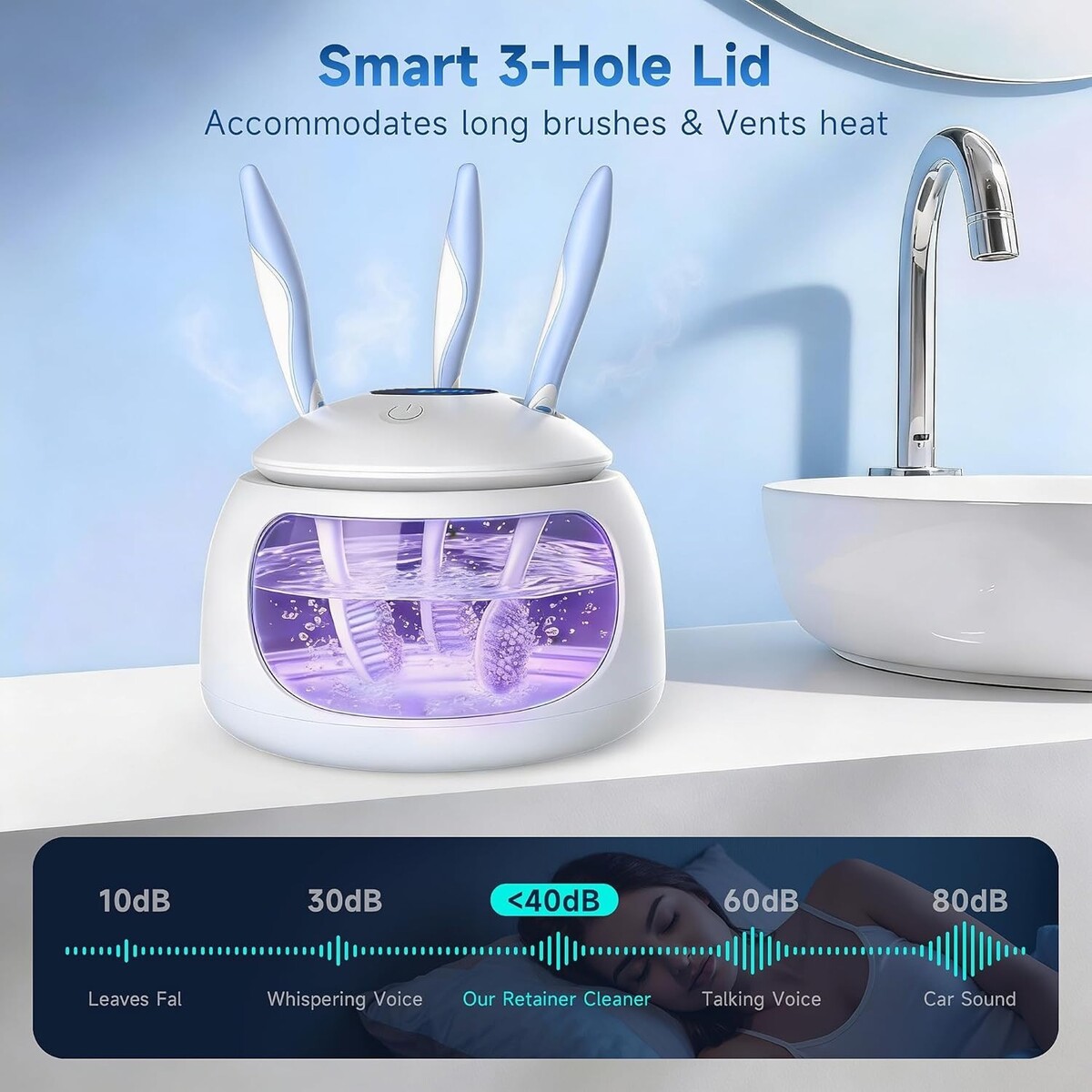 ?3-Hole Lid Design Quiet Operation?Innovative 3-hole ventilated lid (vs. typical 2-hole) securely holds toothbrushes or makeup brushes upright, improving heat dissipation and longevity. Runs at whisper-quiet 40dB with non-slip base?perfect for home, office, or travel without noise.