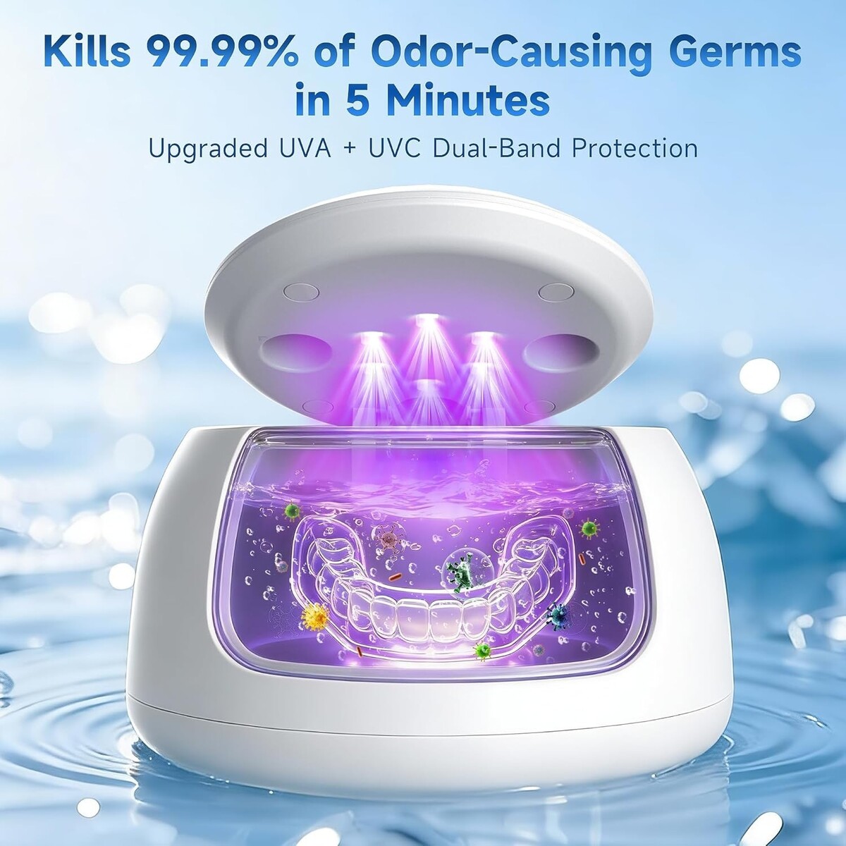 ?Upgraded 6 UV-C Lights Odor Elimination?This denture dome upgraded with 6 powerful UV beads , the dual-band UVC+UVA technology effectively eliminates 99.99% of odor-causing bacteria, keeping your dental appliances clinically fresh and hygienic. Safety Note: UV lights auto-shutoff when the lid is opened.
