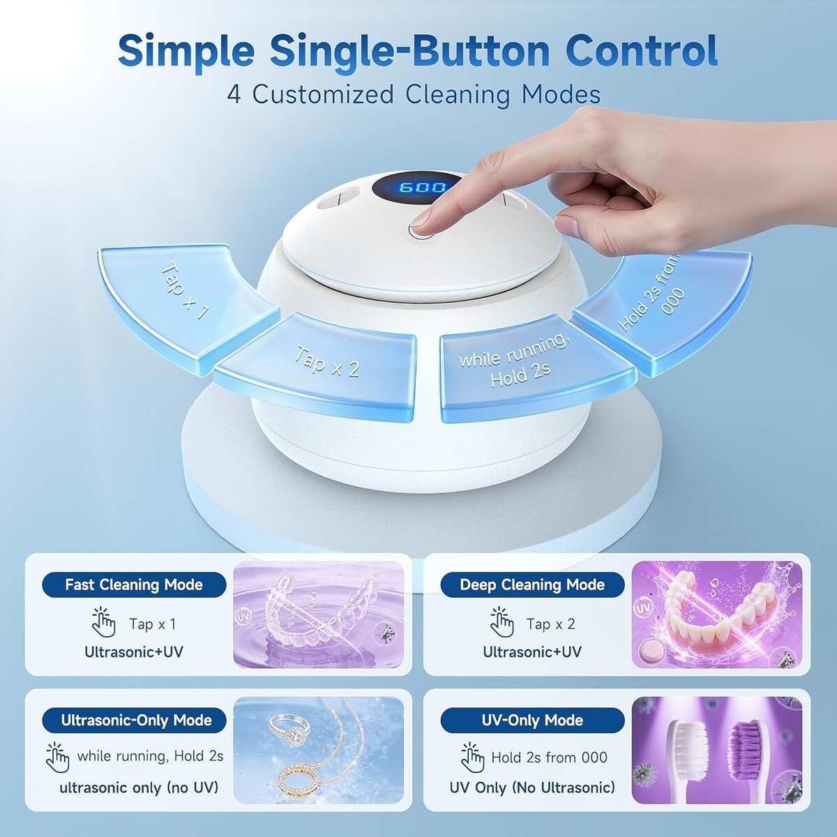 ? 4 Customized Cleaning Modes? Simple single-button control. Fast Cleaning Mode(5 minutes) for daily maintenance; Deep Cleaning Mode(10 minutes) for high-power bursts to tough buildup; Ultrasonic-Only Mode(5-10 minutes) to safely clean delicate jewelry; or UV-Only Mode(10 minutes). Note: For removing heavy stains on dentures, pairing with cleaning tablets is highly recommended.