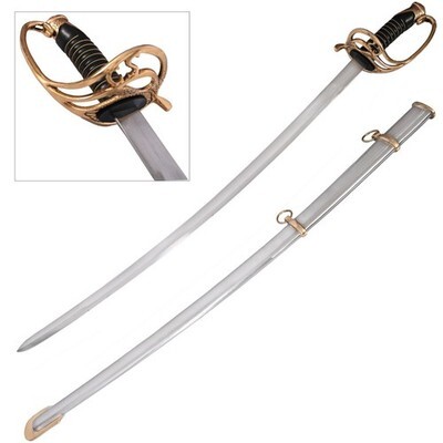 An officers sword is a symbol of power. Its elegance and ornamentation tell the new soldiers that the person carrying it is higher than them in rank. Display your elegance and assert your authority with the Shelby Officer Sword. This beautifully crafted saber bears a wire wrapped hilt protected by a brass guard and pommel, both carved with leaf designs. The slim, decorative blade is made of stainless steel. Includes is the polished steel scabbard with brass accents.