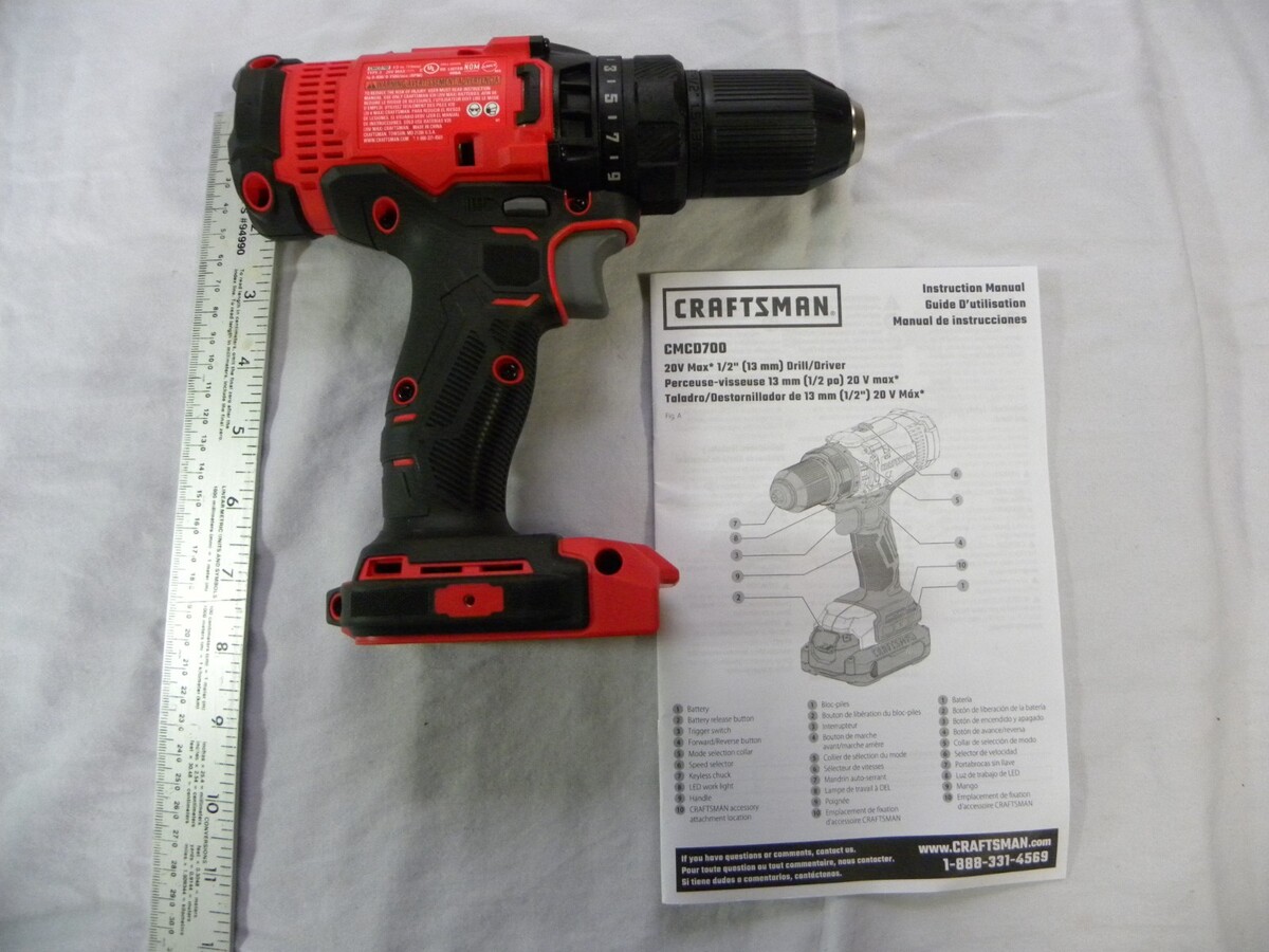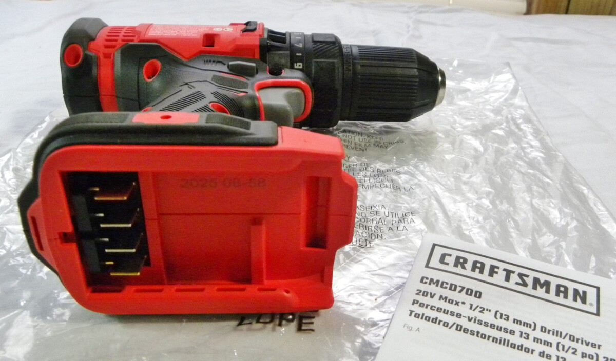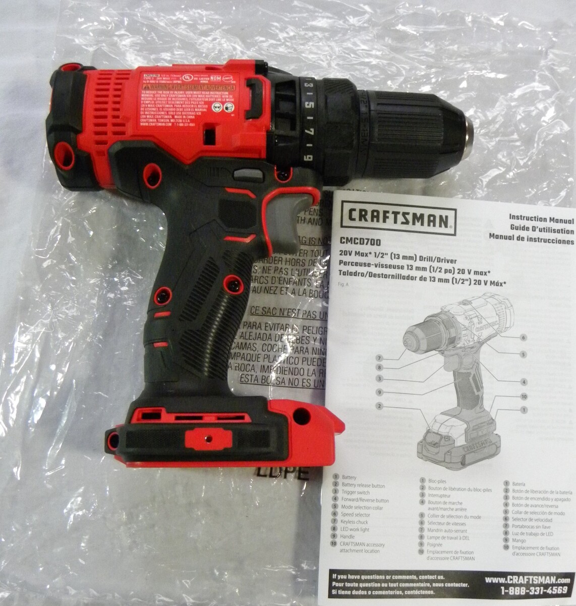 For Sale: NEW Craftsman V20 Cordless 1/2-in Drill/Driver, model CMCD700, with Manual. NO BOX-NO BATTERY. This tool came in a Big Box Set of 3 other Craftsman Tools... I received multiples for Christmas Gifts. This TOOL has not been operated or even turned on. Craftman Batteries are fairly universal for many different tools.