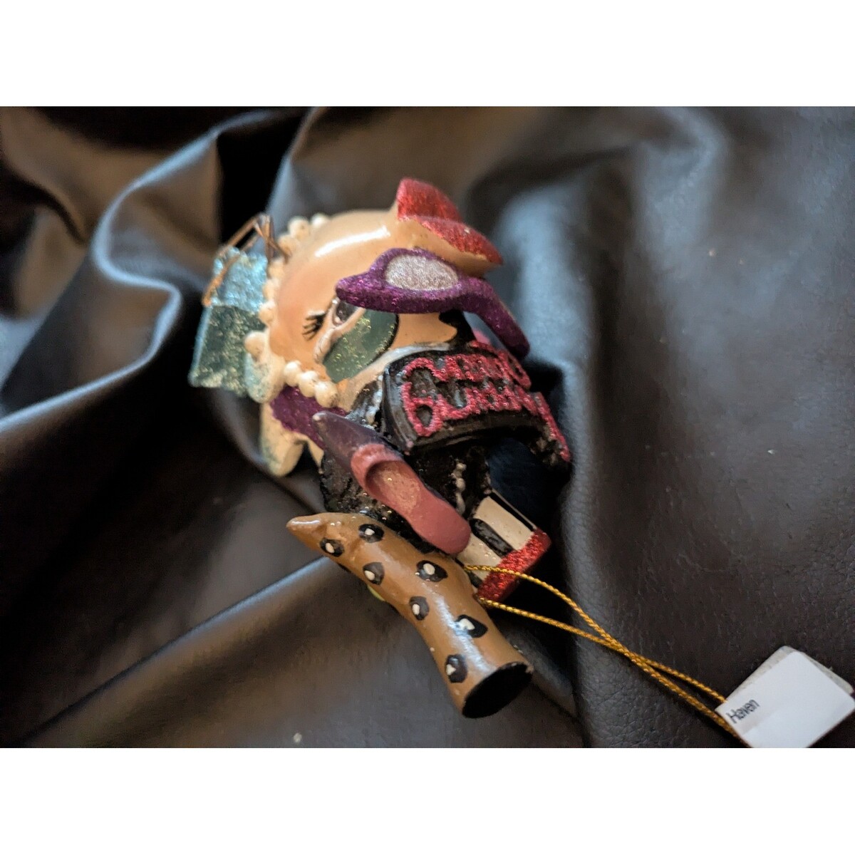 Adorn your holiday tree with this delightful fish ornament, a miniature masterpiece bursting with personality. Its shimmering purple scales catch the light, complemented by sparkling blue fins and ruby-red lips that exude playful charm. Delicate pearls encircle its friendly face, and a tiny glittery handbag dangles from its fin, adding a touch of unexpected glamour. The whimsical headpiece, adorned with a red glittered band and musical notes, hints at a performer ready for the spotlight.