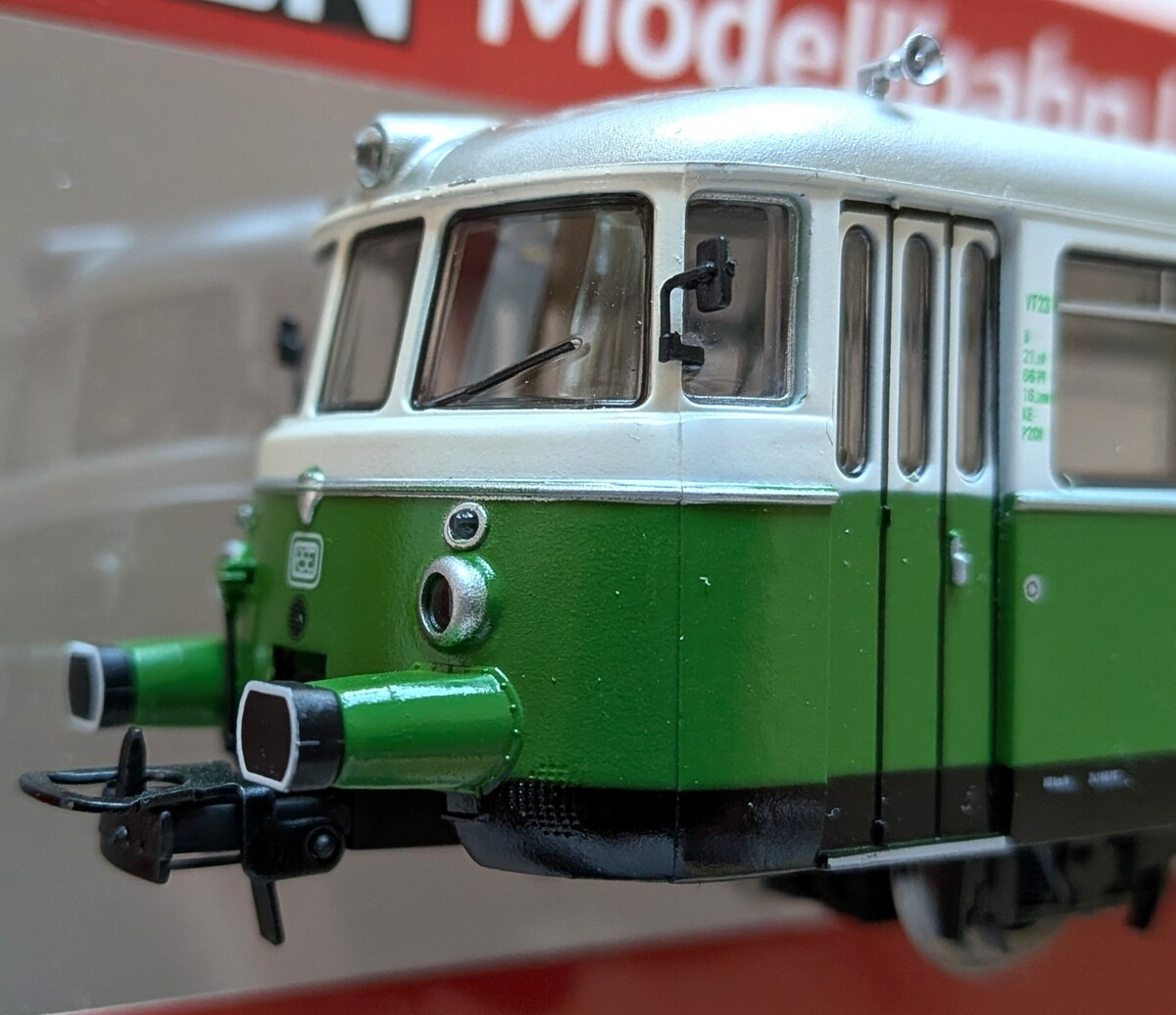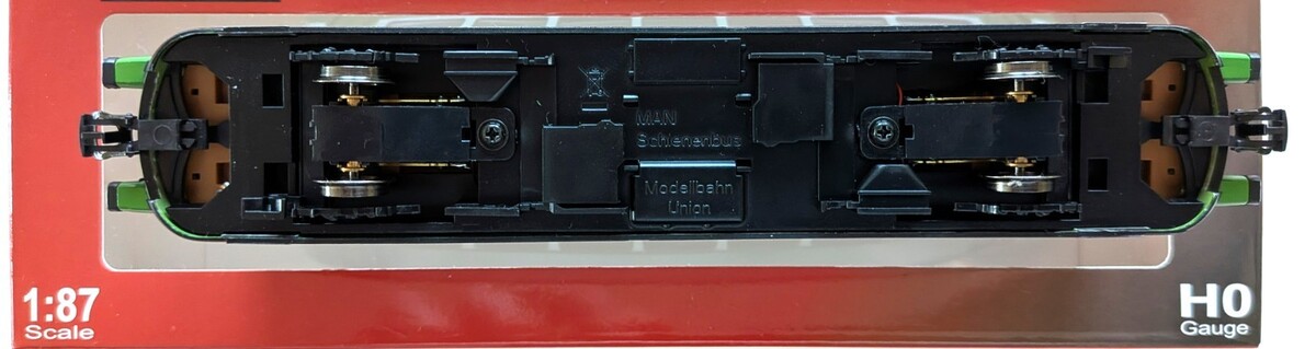 Modellbahnunion (MBU) HO green MAN railbus New in original box with packaging and German manual, will include an English translation. Model is highly detailed (check out the mirrors) with a metal base and plastic body. It comes with a Next18 interface to convert to DC digital. Can be run in DC analog as is or I can include a matching decoder (PD18MU by D M with Next18 interface) for an extra $49. Only opened to take photos, never on tracks.