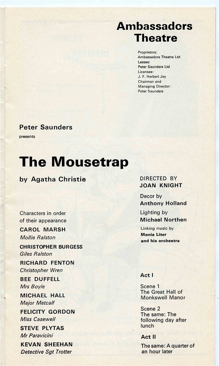 Agatha Christie's The Mousetrap Program Ambassadors Theatre London. Now in its 19th Year, Lots of photos of the production.