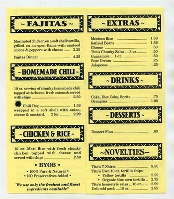 A 6 panel paper fold out menu. Tito's Tacos Menu . With locations in Newport Middletown Rhode Island . Serving Mexican Homestyle Cookin. Measures about 3 3/4" x 8 1/2" when closed.