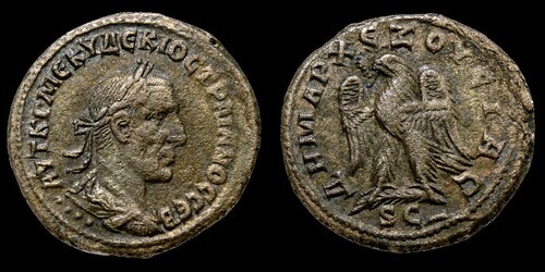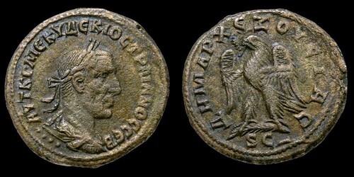 Reverse: ?HMAPX E?OYCIAC, eagle standing left on palm frond, head left, with wings spread, holding wreath in beak, SC in exergue.