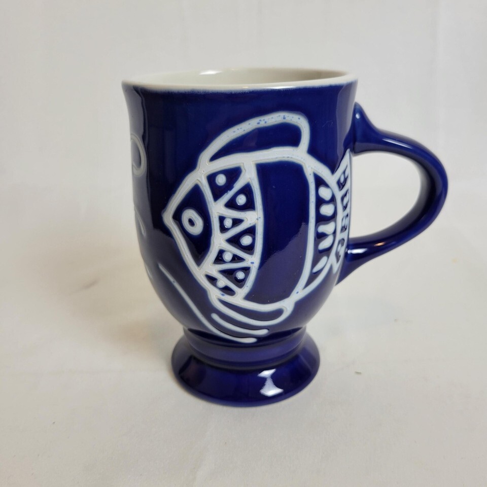 Heavy Duty Fish Motif Blue White Coffee Mug Pedestal Base WCL Kitchen Large Sea