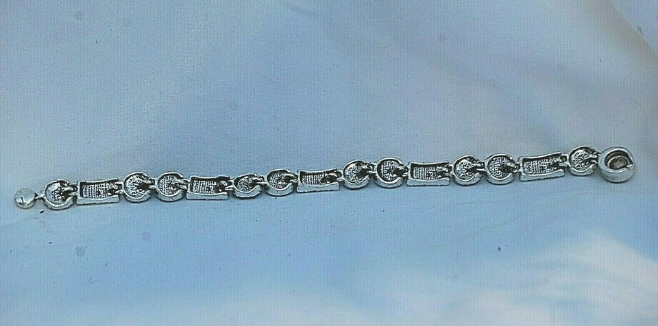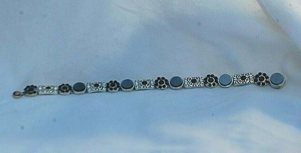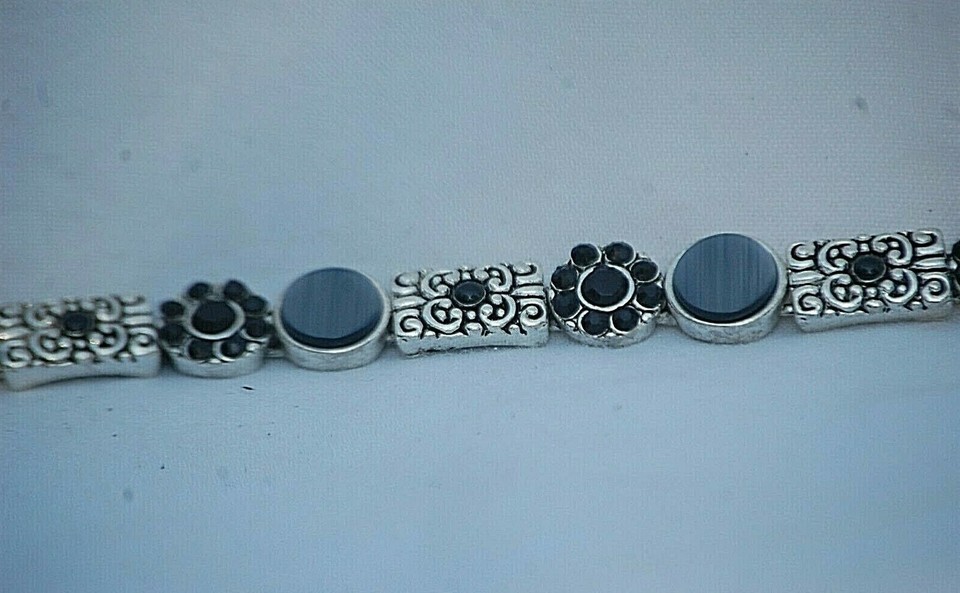 Black Beaded Rhinestones Chain Link Bracelet Silver Tone Costume Jewelry c