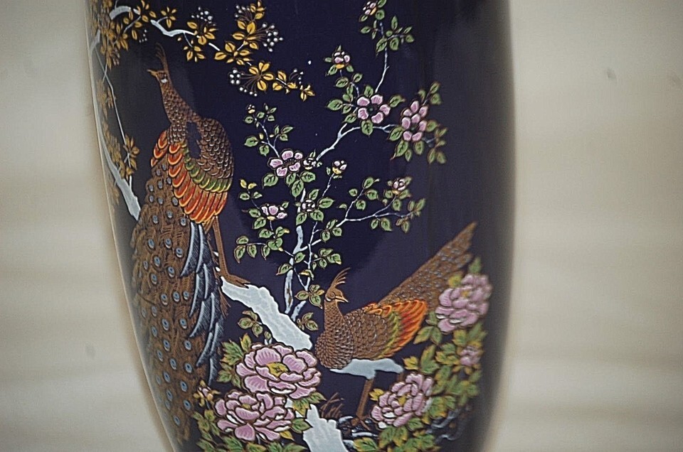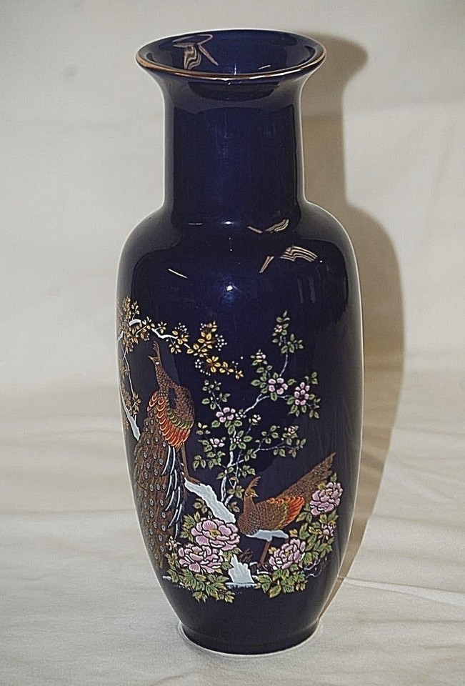 Asian Cobalt Blue Peacock Vase Jar Cherry Blossoms Gold Accents Japan a