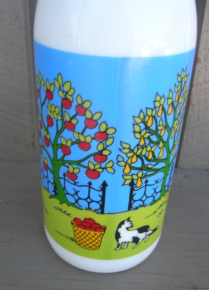 Milk Glass Juice Bottle Duck & Cat Scene Beverage Kitchen Tool Decor