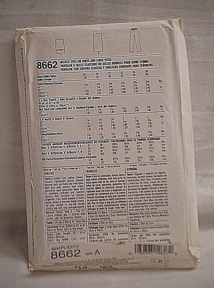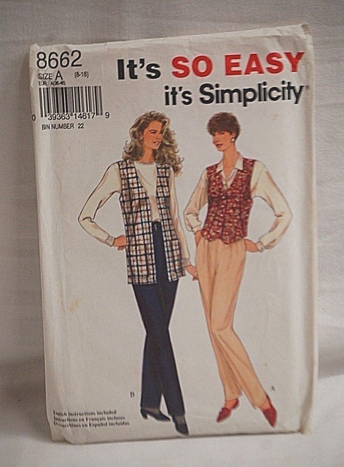 Simplicity Sewing Pattern 8662 Pull on Pants & Lined Vest Size 8-18 Vintage 1993