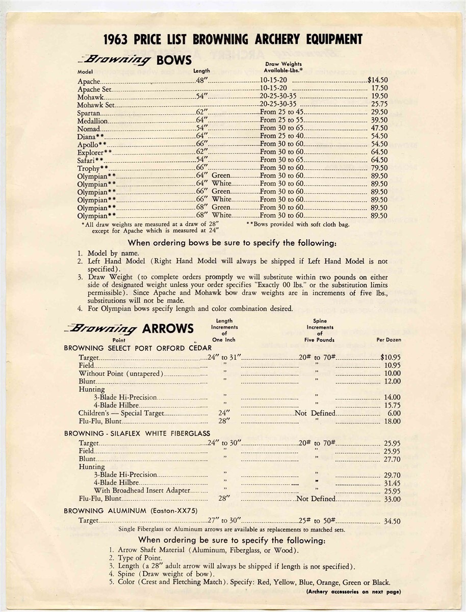 There are 2 items in this lot. A 4 page 1963 Browning Arms Shotgun, Rifles and Pistol , Scopes and Accessories Price List And a 2 sided single page 1963 Price List of Browning Archery Equipment , Arrows and Accessories. Each measures about 8 1/2" x 11".