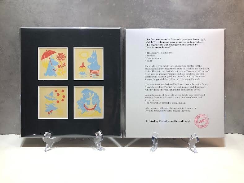 The first Moomin-event "Moomin Hill" was at Stockmann department store in Helsinki in 1956 and these Moomin silk screen prints were for sale there. After Stockmann NK Stockholm had the same Moomin-event.